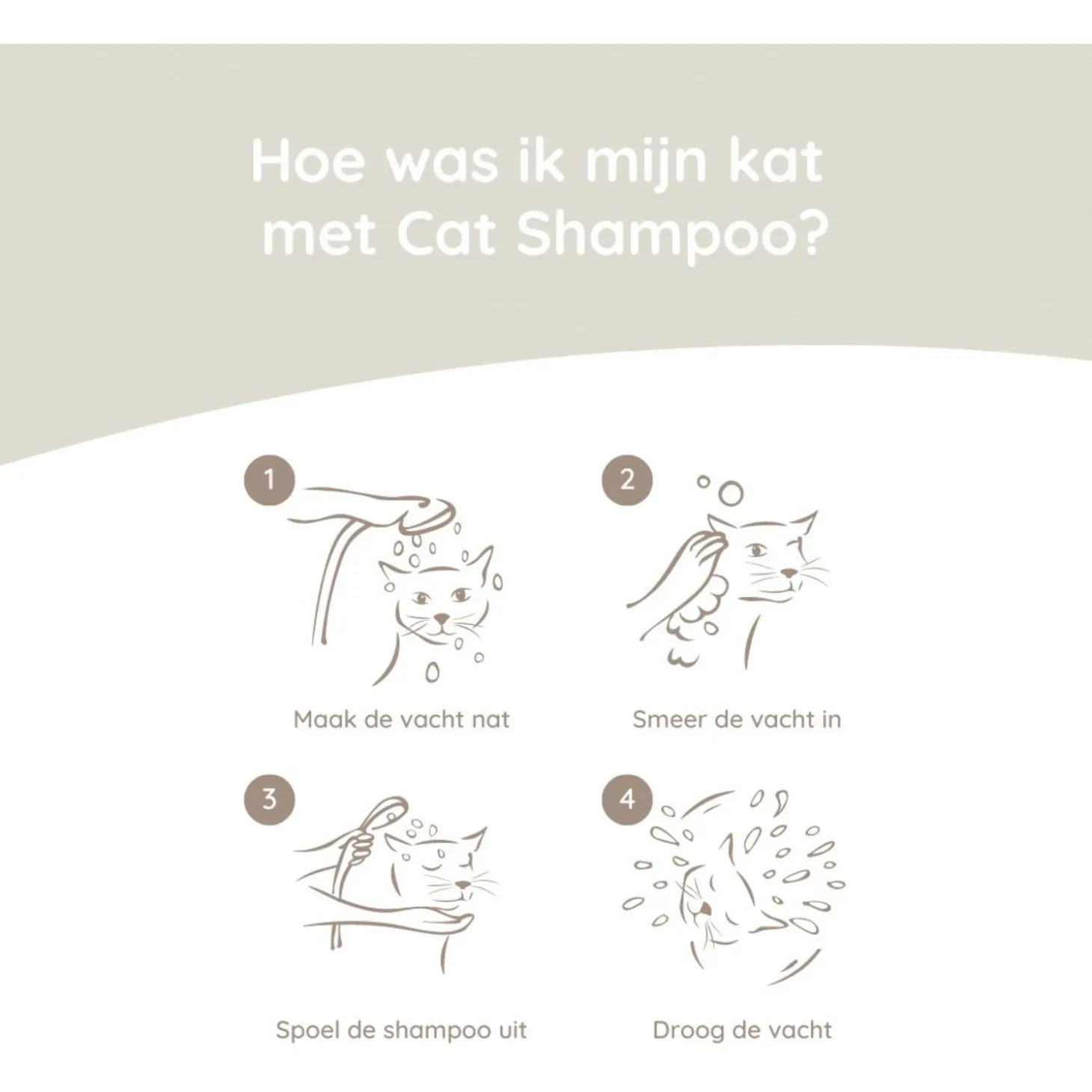 Maak de vacht goed nat met handwarm water. Breng de shampoo aan op de vacht en masseer in van hals tot staart. Laat de shampoo een paar minuten intrekken en spoel daarna af met handwarm water. Droog de vacht af met en handdoek en kam uit.