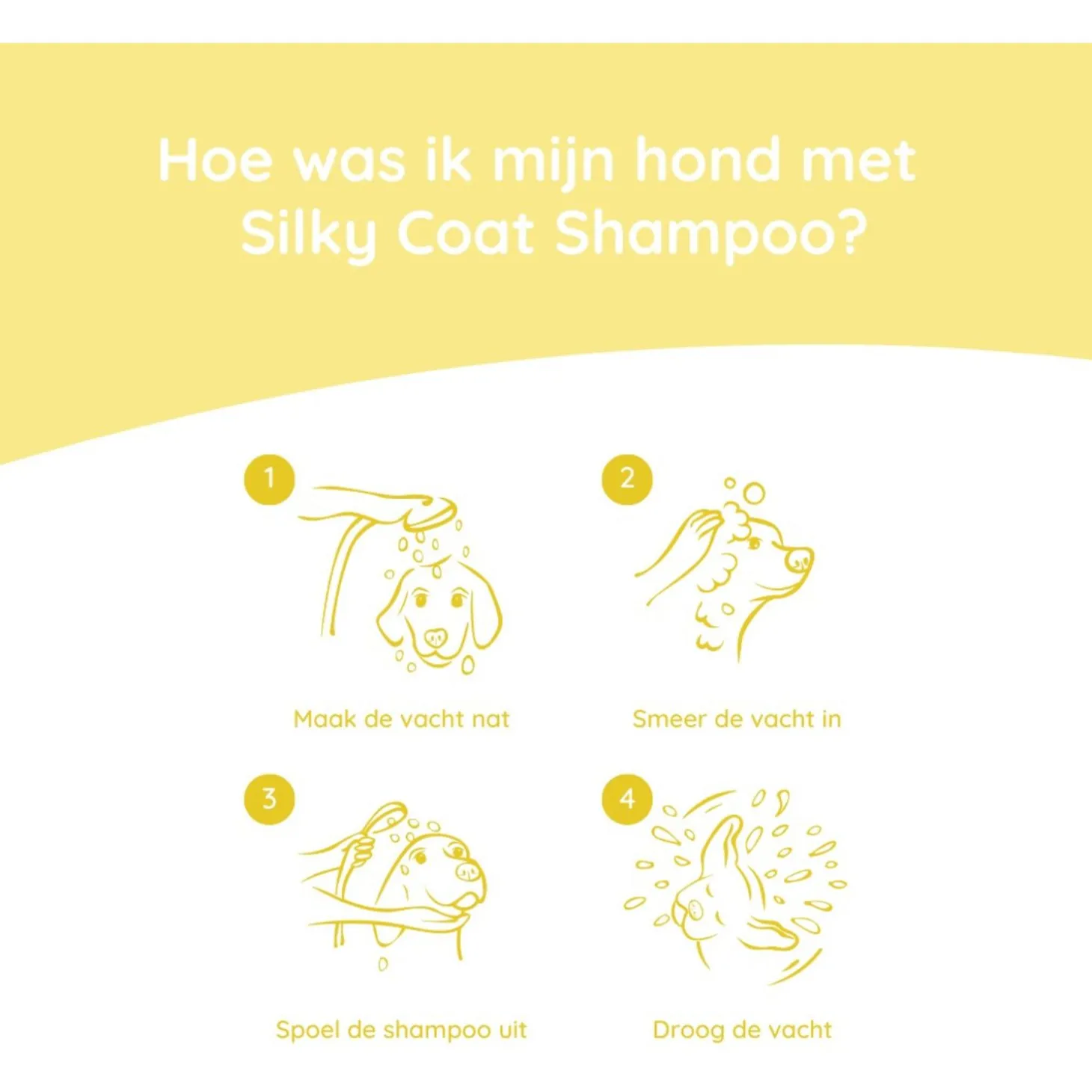 Maak de vacht goed nat met handwarm water. Breng de shampoo met je handen aan op de vacht en masseer je hond vanaf de hals in tot het goed begint te schuimen. Spoel daarna grondig af met schoon handwarm water. Droog de vacht af met een handdoek of met behulp van een haardroger. Borstel de vacht door.