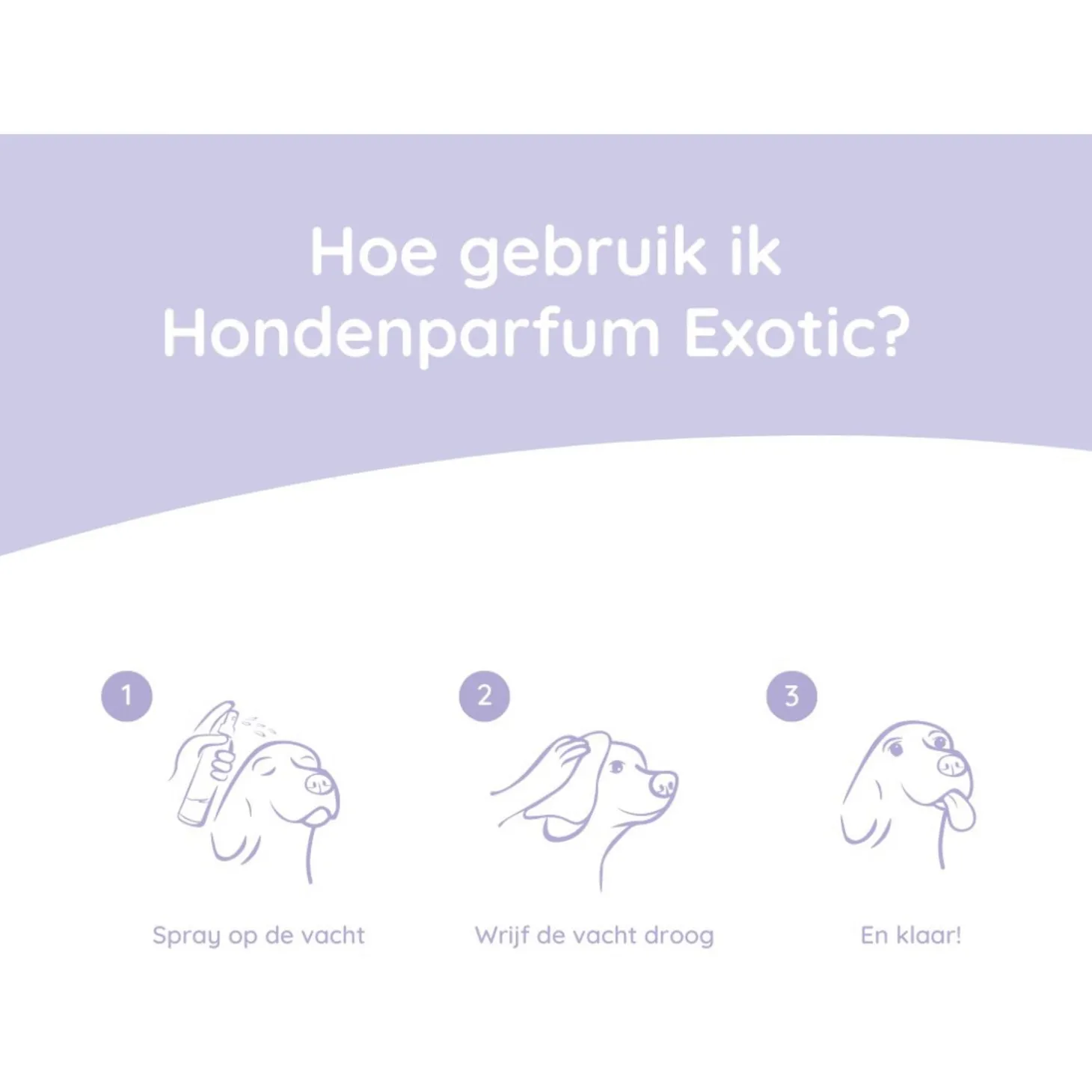 Spray de parfum direct op de hondenvacht. Spray niet in de ogen. Bij kleine honden raden we je aan 1 tot 2 keer te sprayen en bij grote honden 2 tot 3 keer.