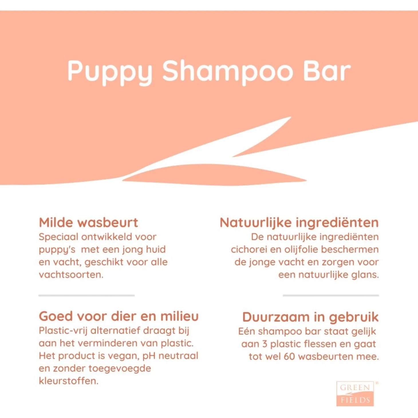Soms kan je viervoeter wel een heerlijke verfrissende wasbeurt gebruiken. De Greenfields Puppy Shampoo Bar is plasticvrij en speciaal ontwikkeld voor jonge viervoeters met alle vachtsoorten. De bar bevat natuurlijke ingrediënten zoals cichorei en olijfolie. Cichorei beschermt de jonge vacht en laat deze glanzen en de olijfolie zorgt voor een natuurlijke hydratatie.