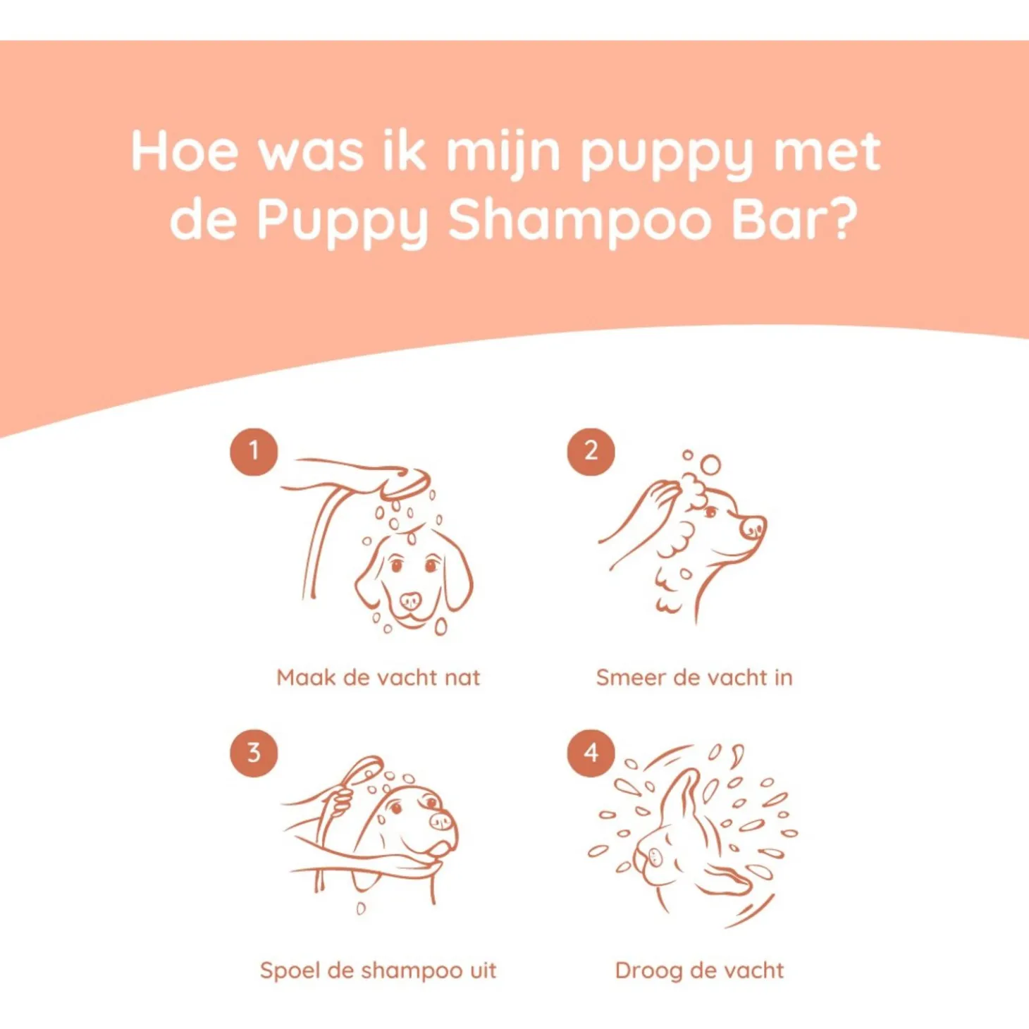 Borstel de vacht indien nodig vooraf. Maak je hond nat in bad of onder de douche en masseer de shampoo bar over de vacht van je hond tot er schuim ontstaat en wrijf de vacht lekker in. Let op voor de ogen en oren van jouw hond. Spoel je hond af met lauwwarm water tot alle shampoo eruit is. Droog daarna je hond af!