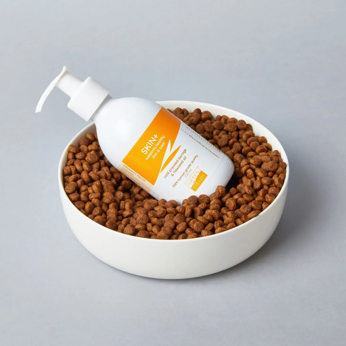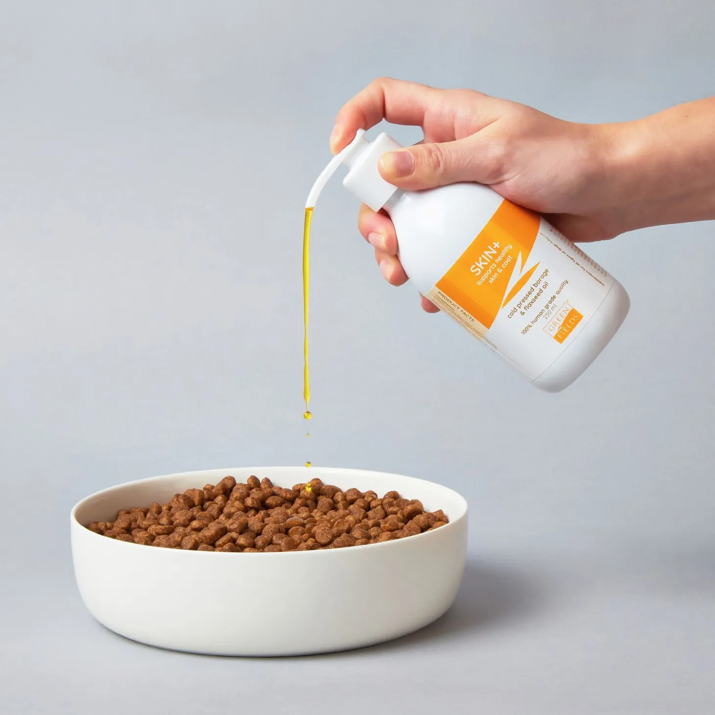 Greenfields Skin+ kan je direct gebruiken. Door de handige fles kan je gemakkelijk een aantal pompjes, volgens de doseringstabel, op het voer van je hond toevoegen. Het is het beste om de dosering op de bouwen met in de eerste week een halve dosering, tweede week driekwart en de derde week volledig.