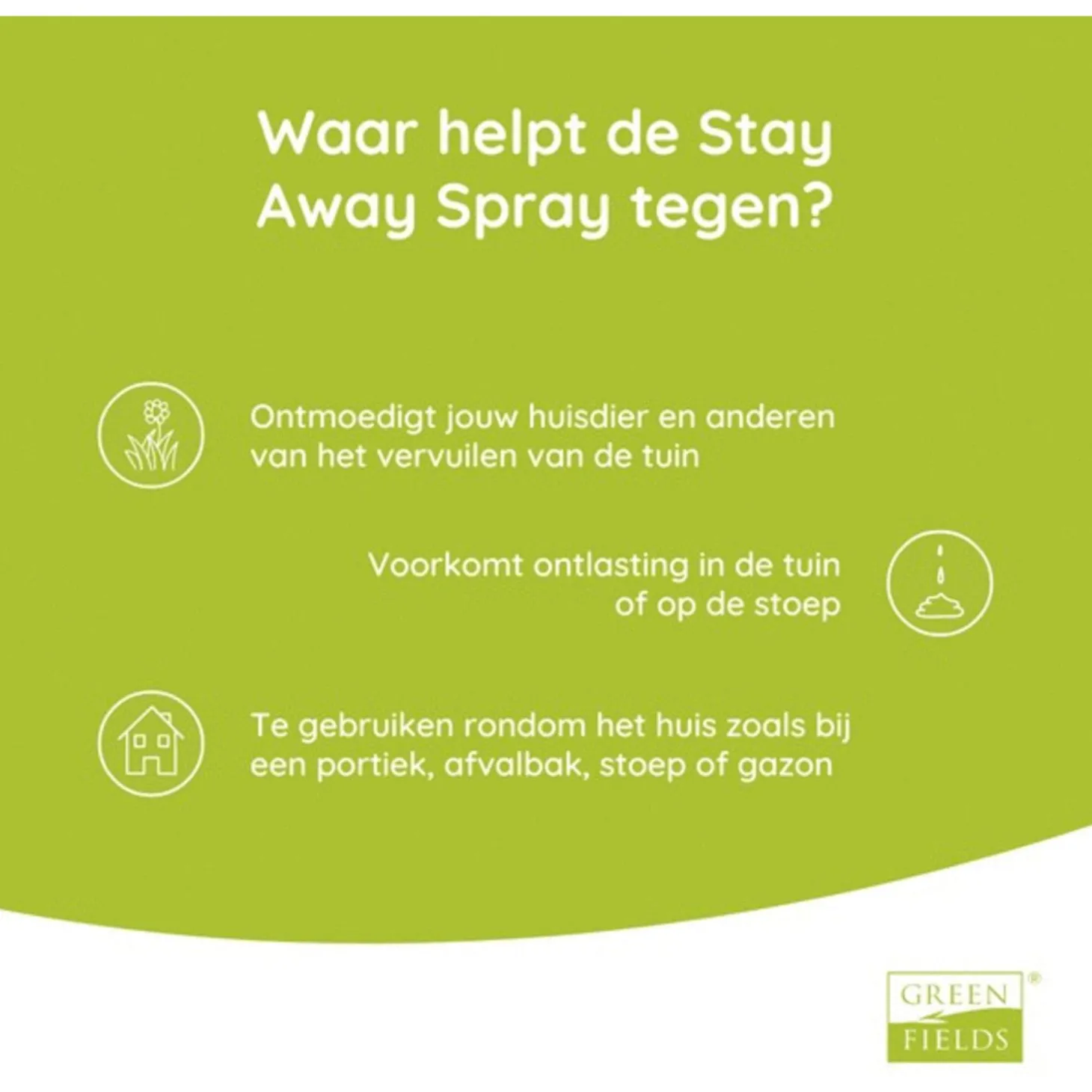 Deze spray helpt te voorkomen dat honden en katten ongewenst hun behoeften in jouw tuin of op de stoep doen. De Greenfields Trainingsspray kan je gebruiken op alle plaatsen en oppervlakten waar dieren hun territorium afbakenen, zoals een portiek, stoep, afvalbak of gazon.