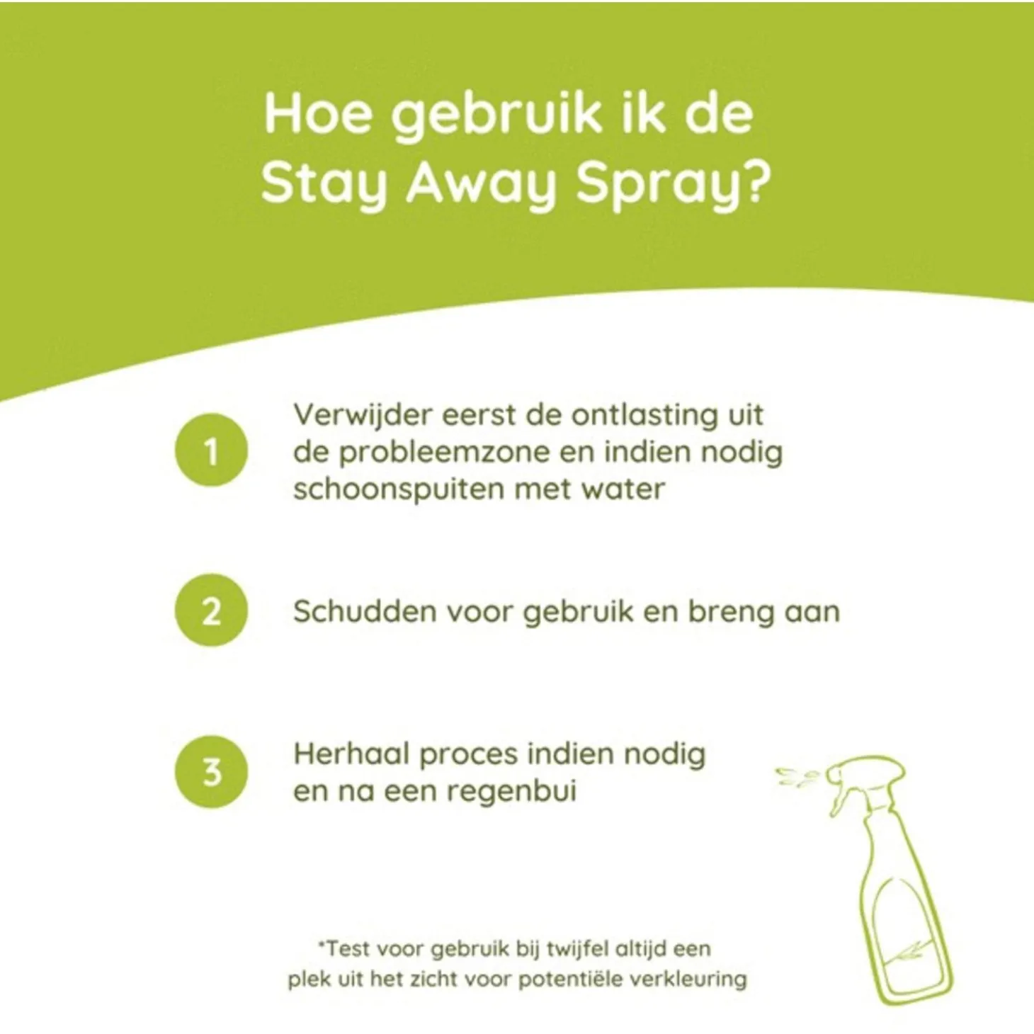 | Aanbeveling | Verwijder eerst de ontlasting uit de probleemzone. Indien nodig nog schoonspuiten met water. Schud de fles voor gebruik. Breng nu de stay away spray aan. Indien nodig kan dit herhaalt worden voor hardleerse huisdieren. Ook dient het herhaalt te worden na een regenbui |