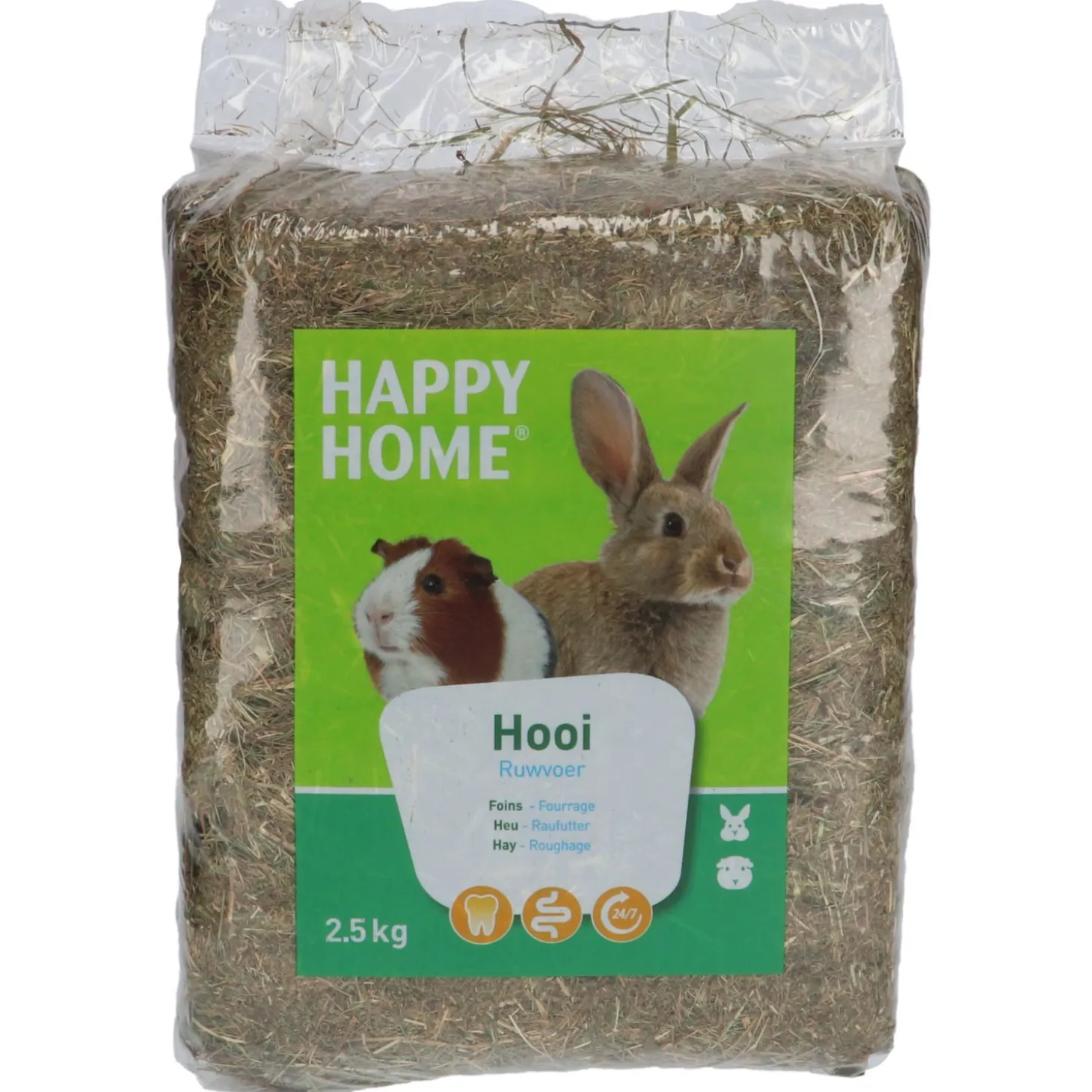 Een lekkere variant is de Happy Home Weidehooi. Met dit geschoonde weidehooi waant je dier zich op een frisse alpenweide. Dit hooi zal zorgen voor een gezonde darmflora en een algehele goede conditie van je dier. Je kán het hooi ook gebruiken als bodembedekking, maar het blijft schoner en lekkerder in een hooiruif, of daag je konijn uit met een voerbal gevuld met hooi. Konijnen en knaagdieren mogen hooi onbeperkt eten.