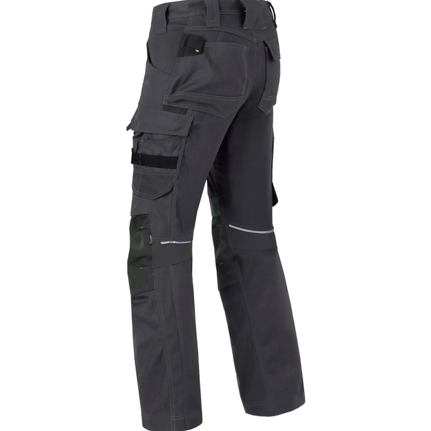 | Samenstelling | verdekte ritssluiting, 2 ruime ingezette zijzakken waarvan 1 extra zakje met rits, 2 ruime achterzakken waarvan 1 met klep, loshangende duimstokzak met extra toolzakjes, ruime loshangende dijbeenzak met klep en extra opbergmogelijkheden door de geïntegreerde GSM-zak en de extra toolzakjes, makkelijk toegankelijke Cordura® kniezakken met opening aan bovenzijde afsluitbaar met klep en klittenband, voorgevormde broekspijpen voor zeer goede pasvorm, Cordura® versterkingen en drievoudig gestikte naden op kwetsbare plekken voor een extra lange levensduur, brede riemlussen, verstelbare hamerlus d.m.v. drukknoop, zeer sterk ademend stretch doek (polyamide/Lycra) in de knieholte voor optimaal draagcomfort, extra inzet bij kruis ter voorkoming van uitscheuring, 1 D-ring voor badgehouder, reflecterende piping |