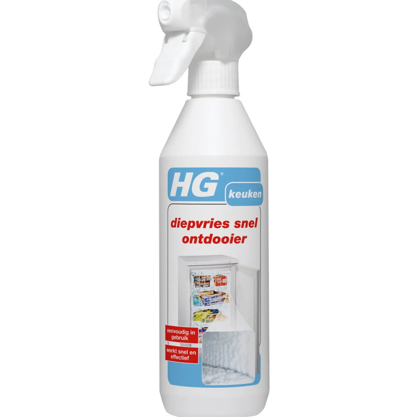 | Aanbeveling | Maak de diepvries eerst leeg en verwijder zoveel mogelijk los ijs. Spuit vervolgens het vastzittende ijs gelijkmatig en ruim in met HG diepvries snel ontdooier. Laat het enkele minuten inwerken en verwijder het losgekomen ijs. Maak na het verwijderen van het ijs de wanden van de diepvries droog. De diepvries kan daarna weer in gebruik worden genomen. Bewaarrichtlijn: Attentie: Fles rechtop vervoeren en bewaren. |