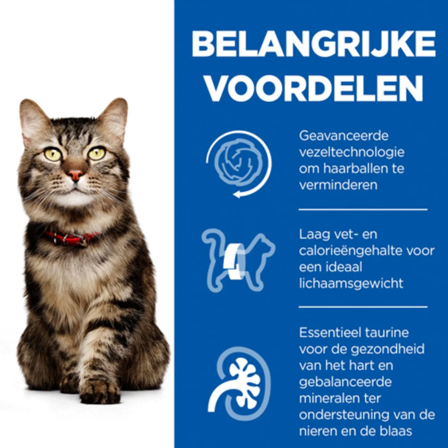 De brok met kip bevat een geavanceerde vezeltechnologie om haarballen te reduceren. Ook is voeding laag in vetgehalte en calorieën voor een ideaal lichaamsgewicht. De eiwitten in de brokken zijn van hoge kwaliteit, speciaal voor sterke spieren. De brokken bevatten geen kunstmatige kleur-, smaak- en conserveringsmiddelen.