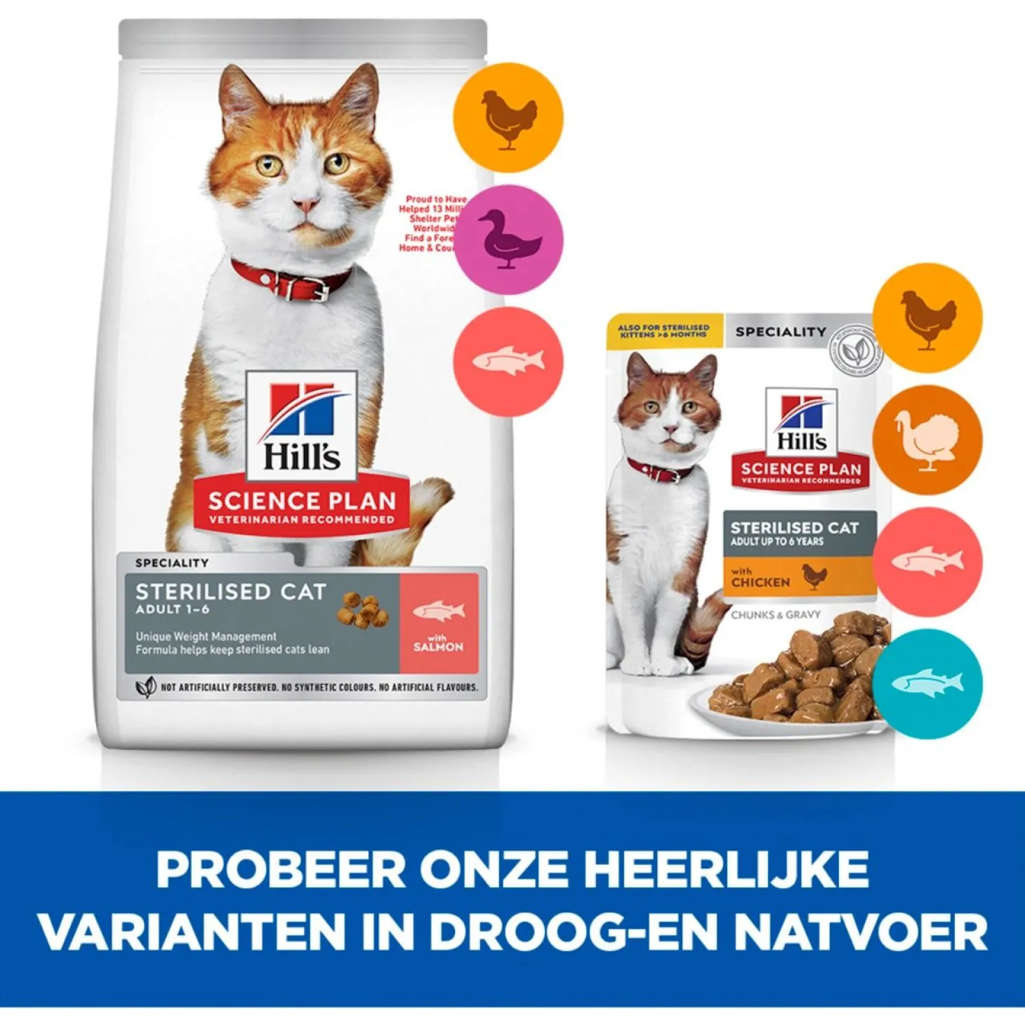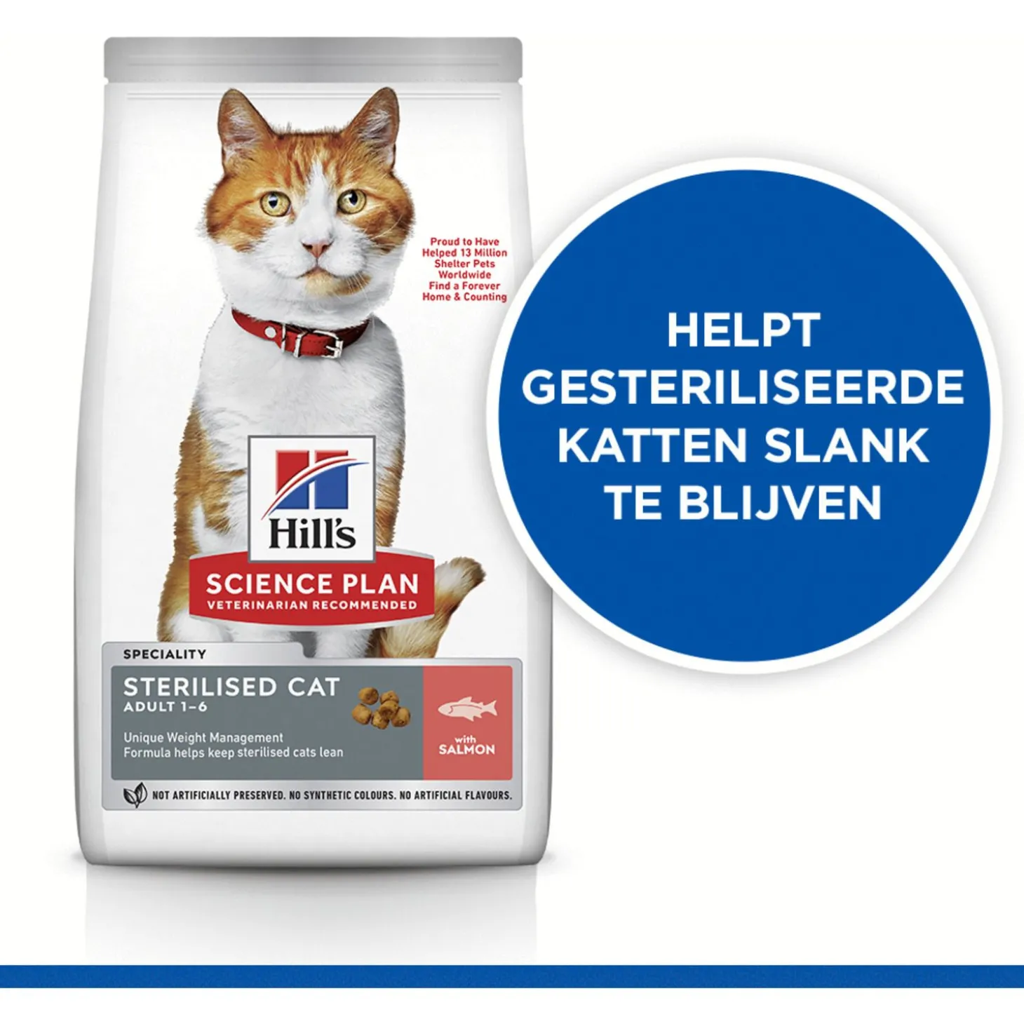 | Samenstelling | Maïs, gebroken rijst, tarwe, kippen- en kalkoenenmeel, erwteneiwit, maïsglutenmeel, zalmmeel (5%), dierlijk vet, mineralen, eiwithydrolysaat, visolie, plantaardige olie. |