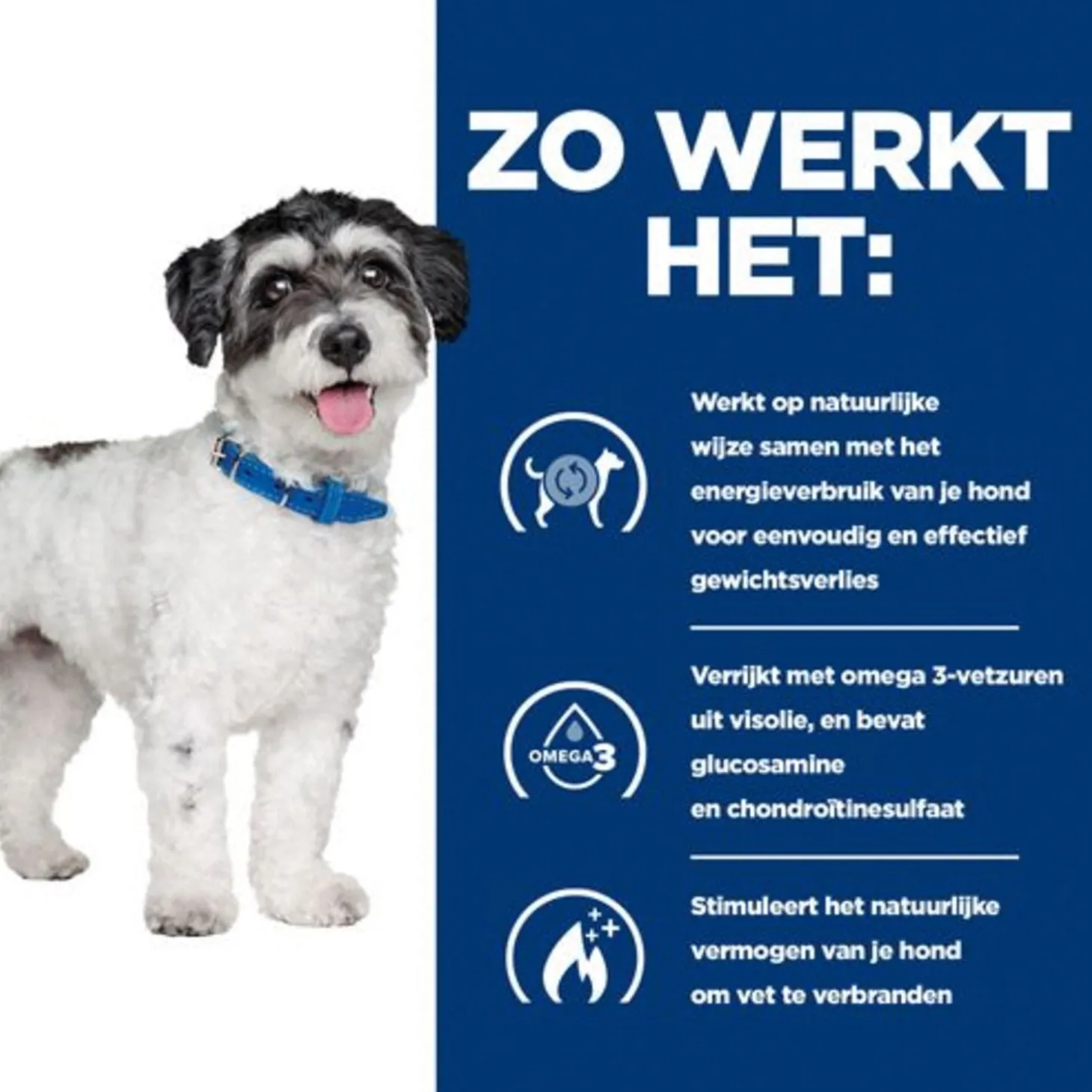 Hill’s voedingsdeskundigen en dierenartsen hebben Prescription Diet Metabolic + Mobility Mini dieetvoeding voor huisdieren ontwikkeld, speciaal samengesteld om het gewichtsbeheer en de gewrichtsgezondheid van je huisdier te ondersteunen. Werkt natuurlijk met het unieke energieverbruik van je hond voor gemakkelijk en effectief gewichtsverlies en kan langdurig worden gebruikt. In feite is Prescription Diet Metabolic + Mobility Mini klinisch bewezen voeding om honden te helpen op natuurlijke wijze gewicht te verliezen en de mobiliteit te verbeteren in slechts 21 dagen. Dit droogvoer heeft een onweerstaanbare kipsmaak waar je hond dol op zal zijn.