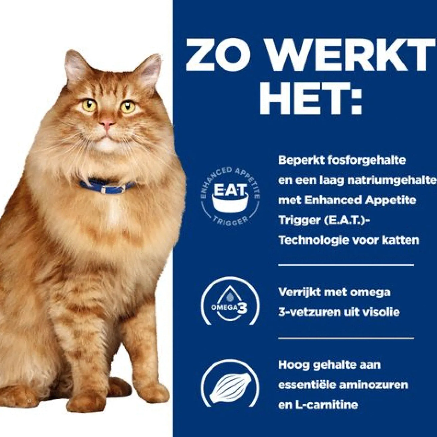 - Gecontroleerde fosfor en laag natriumgehalte, met hoge kwaliteit eitwitten om de vitale nierfunctie te helpen beschermen