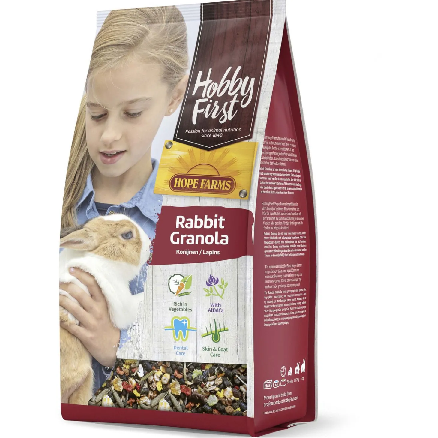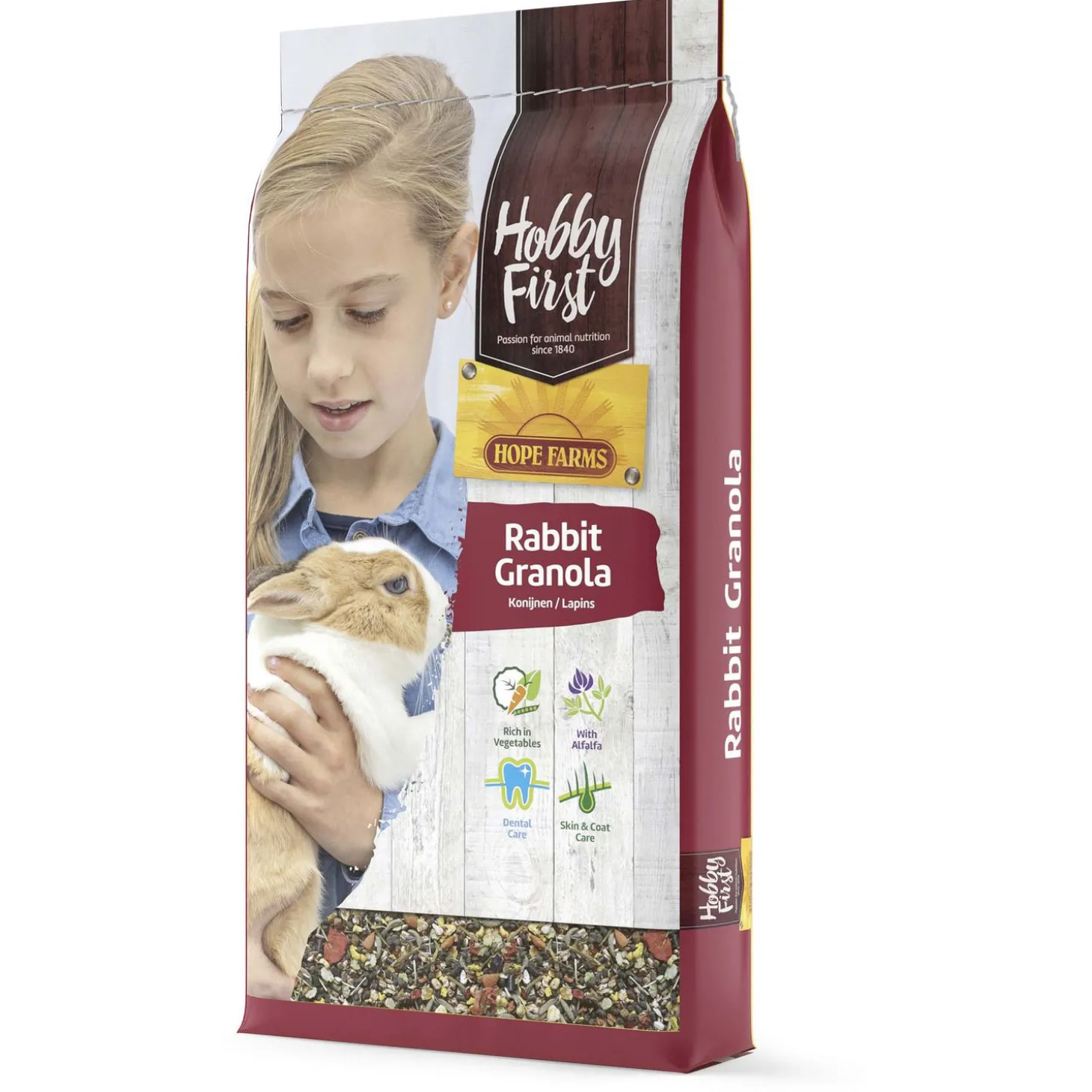 Een smakelijke en gemengde voeding geschikt voor het Konijn is de Rabbit Granola van HobbyFirst. Deze voeding bestaat uit hoogwaardige grondstoffen en smakelijke ingrediënten. Een voeding die voldoet in de complete voedingsbehoefte van je Konijn. Een rijke mengeling bestaande uit smaakvolle groenten zoals wortel, erwten en stukjes johannesbrood. Afgestemd op specifieke behoeften van je Konijn zoals een toevoeging van Luzerne (alfalfa) voor extra voedingsvezels voor een optimale spijsvertering. Door de variatie in deze voeding van verschillende structuren draagt het bij aan een goede gebitsverzorging.