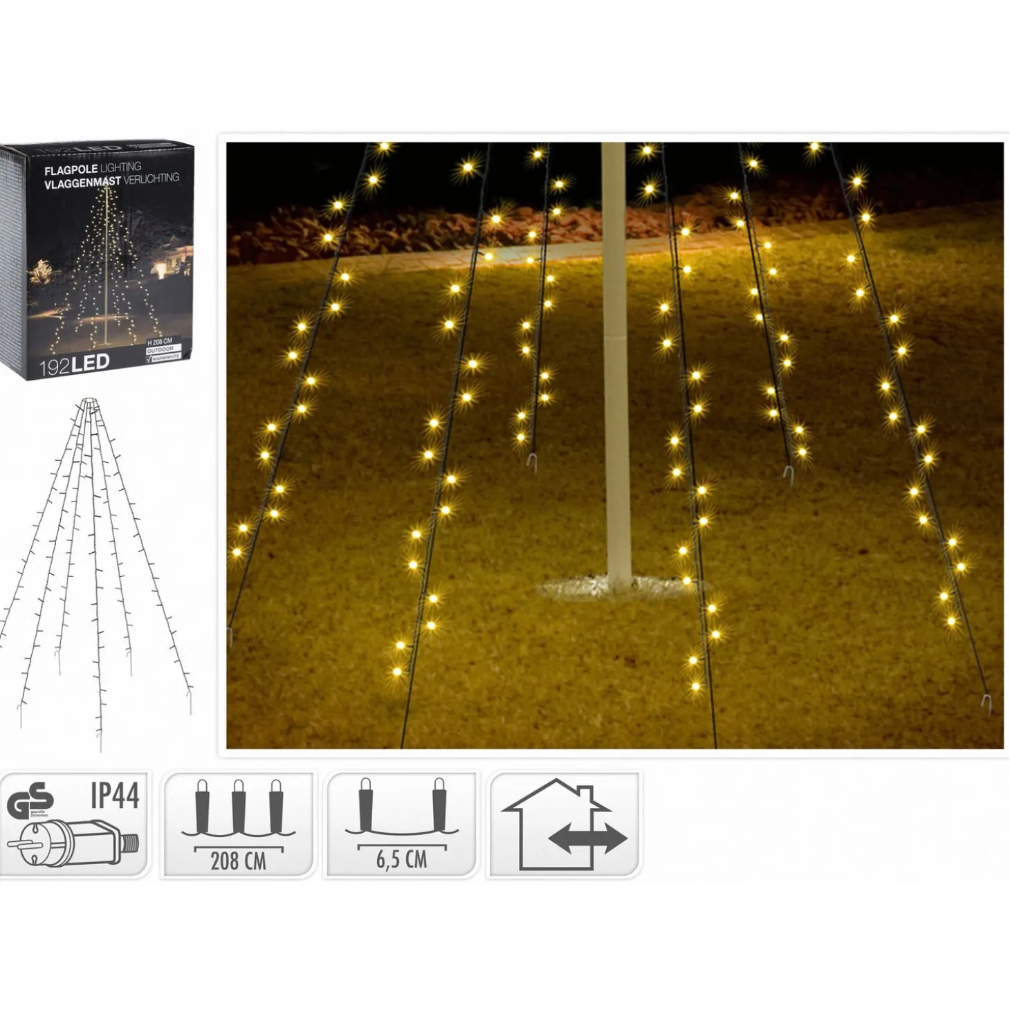 Vlaggenmast – 192 lampjes – 6 strengen van 2,08 meter – inclusief 6 haringen.