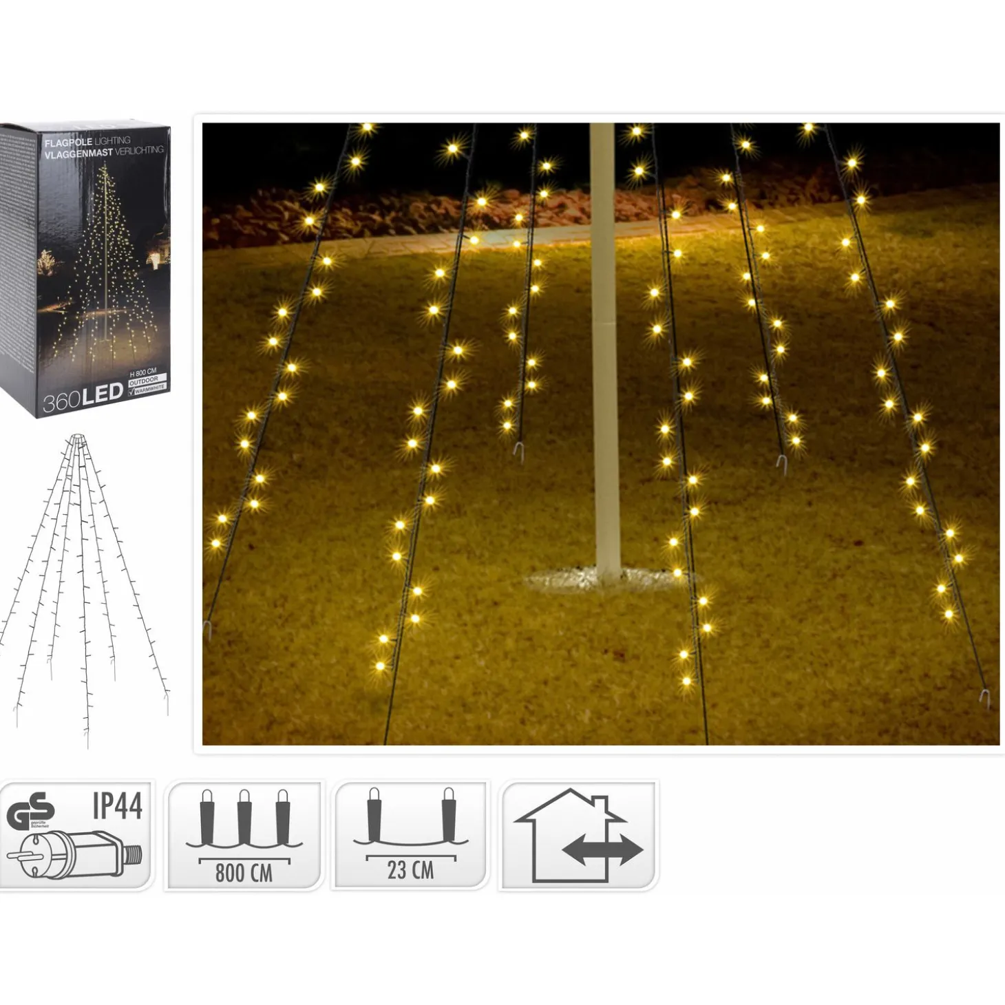 Door het gebruiken van verlichting in en rondom je huis en tuin kan je de perfecte winter- of kerstsfeer creëren. De Vlaggenmast Verlichting van Homestyle is prachtige vlaggenmastverlichting, alsof je een kerstboom van lampjes in je tuin hebt staan. Deze vlaggenmast bestaat uit 360 Ledlampjes die een warm, wit licht uitstralen. De lampjes zijn verdeeld over 10 strengen van 8 meter (36 ledjes per streng). Er zit 23 cm tussen de lampjes.