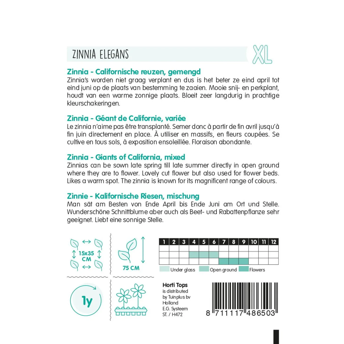 - Geeft enorm grote gevuldbloemige zinnia’s
