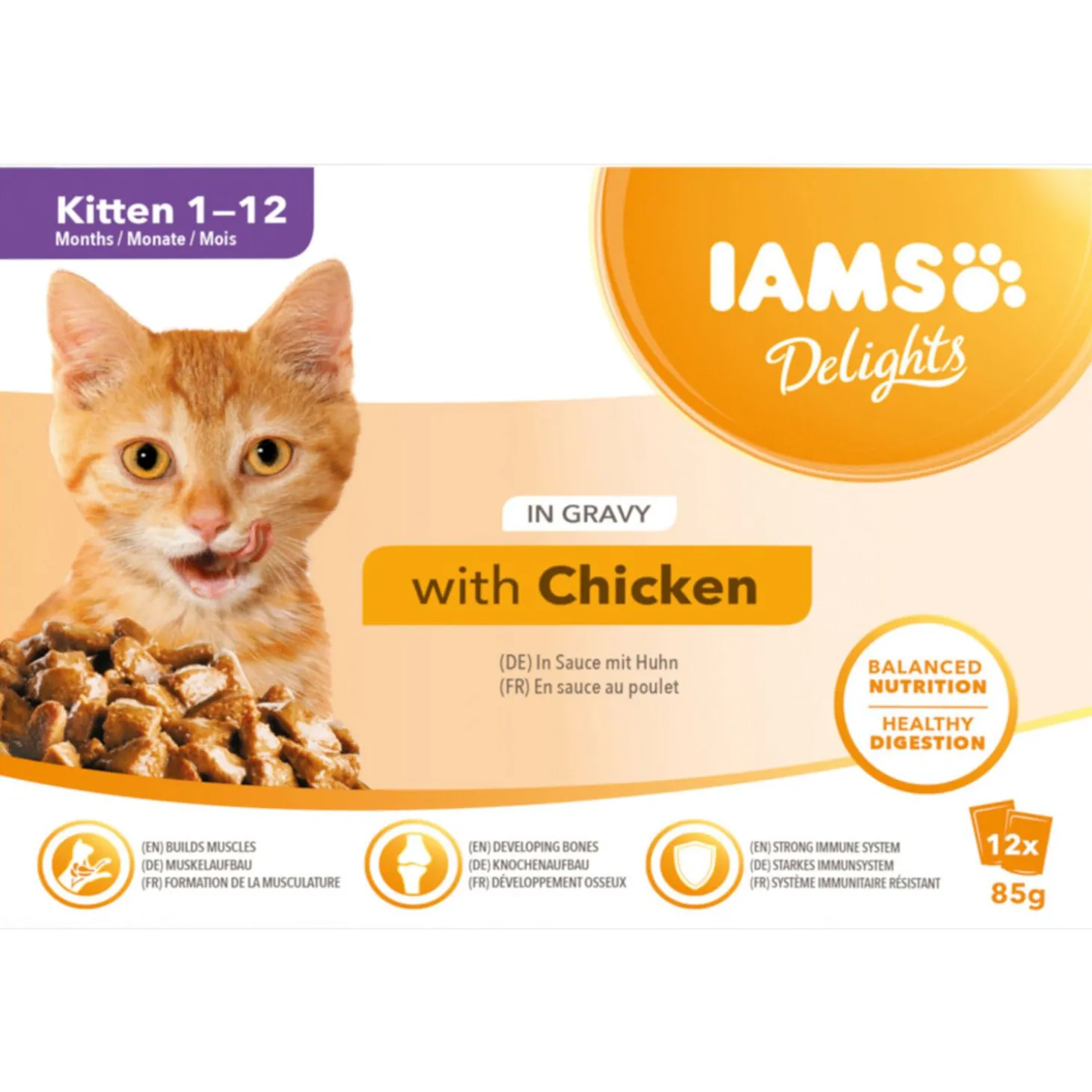 | Aanbeveling | Voedingsrichtlijnen:Tot 20 weken: per dag ca. 3½ zakje per kilo lichaamsgewicht verdeeld over 4-6 maaltijden.⏎20 tot 40 weken: per dag ca. 2 zakjes per kilo lichaamsgewicht verdeeld over 3-4 maaltijden. Vanaf 40 weken: per dag ca. 1¼ zakje per kilo lichaamsgewicht verdeeld over 2-3 maaltijden. Afhankelijk van leeftijd, temperament en activiteit kan uw kat meer of minder eten. Zorg dat er altijd voldoende vers water klaarstaat. Stap niet in één keer over op IAMS, maar geleidelijk gedurende 4 dagen. |