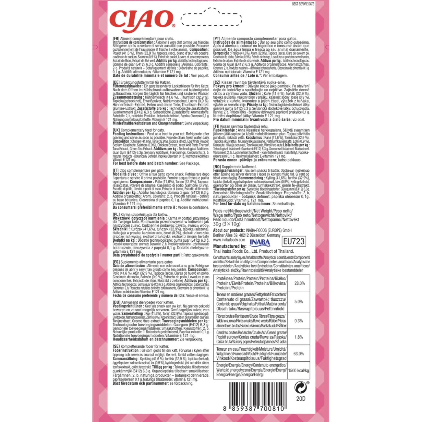 | Samenstelling | Kip (41,6%), Tonijn (32,9%), Tapioca (gedroogd), Eiwitpoeder, Natriumcaseïnaat, Zalm (0,9%), Kippenextract, Gist en bestanddelen daarvan, Tonijnextract, Groene thee-extract. |