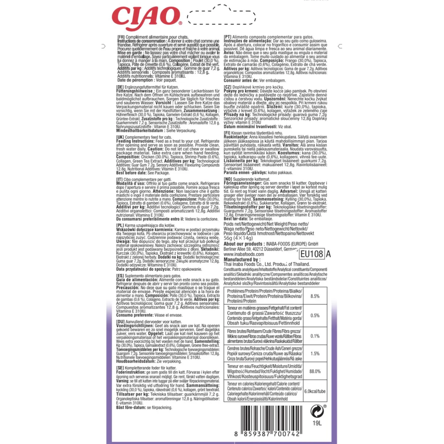 | Analyse | Eiwit 8.5%, Vetgehalte 0.5%, Ruwe vezels 0.1%, Ruwe as 1.5%, Vocht 88.0%, Caloriegehalte 6.0kcal/tube |