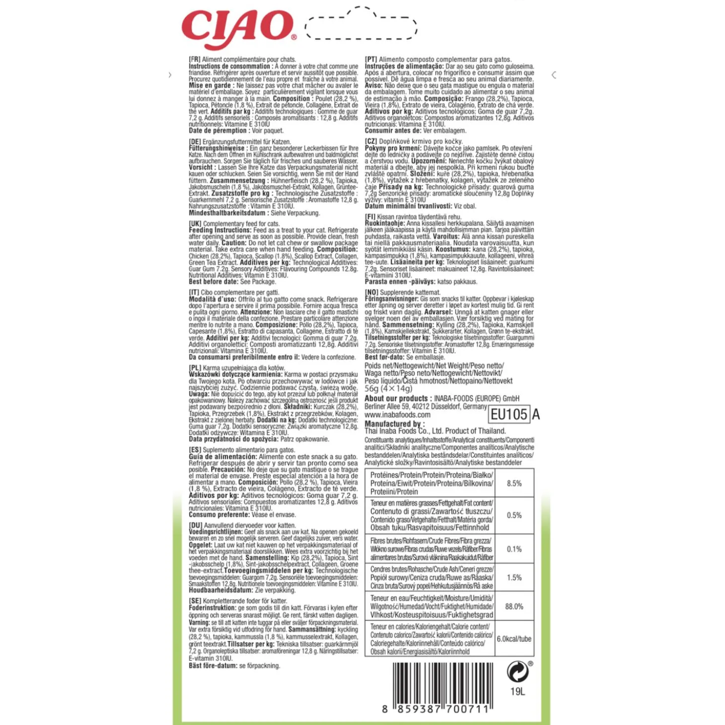| Samenstelling | Kip (28,2%), Tapioca, Sint-jakobsschelp (1,8%), Sint-jakobsschelpextract, Collageen, Groene thee-extract. |