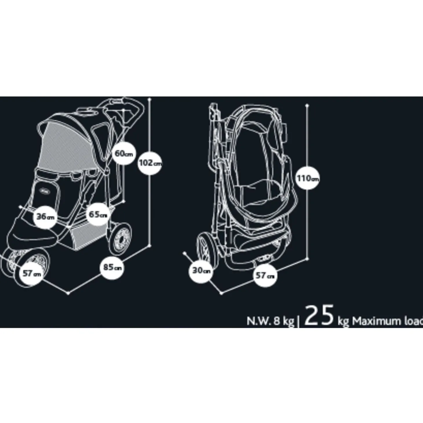 - Afmetingen buggy ingeklapt: L110 x B57 x H30 cm