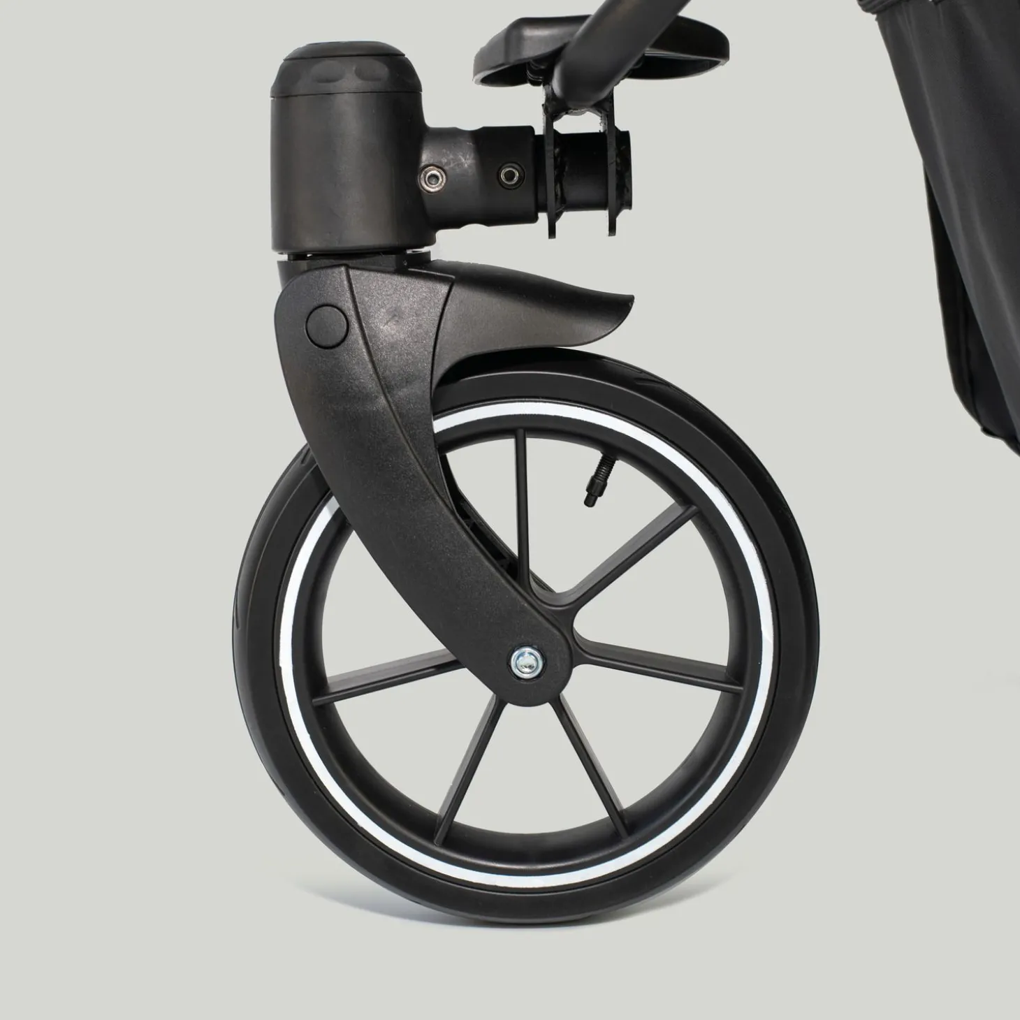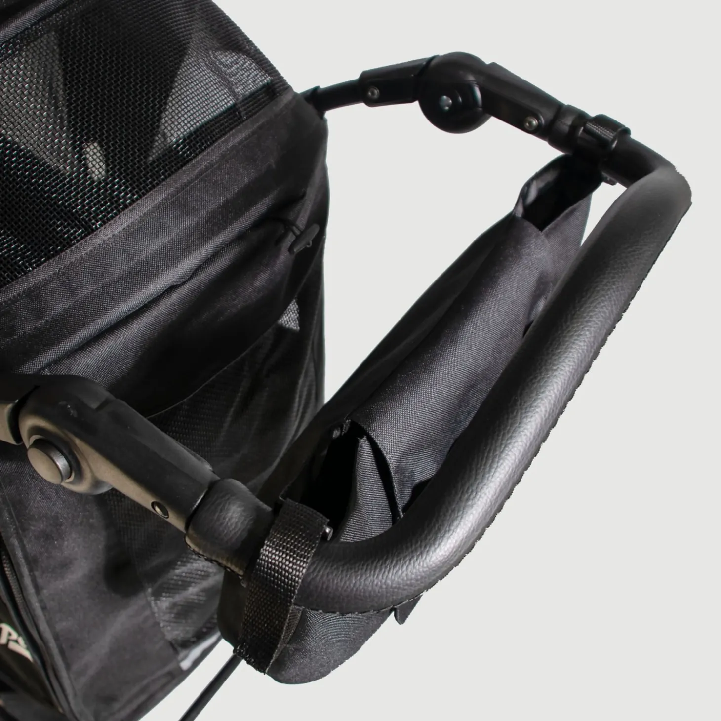 De kunstlederen ergonomische duwstang is in lengte te verstellen zodat je comfortabel de buggy kunt voortduwen. De stang biedt genoeg ruimte tussen mens en buggy waardoor je niet per ongeluk tegen de as aantrapt. Op de achterwielen zit een rem.