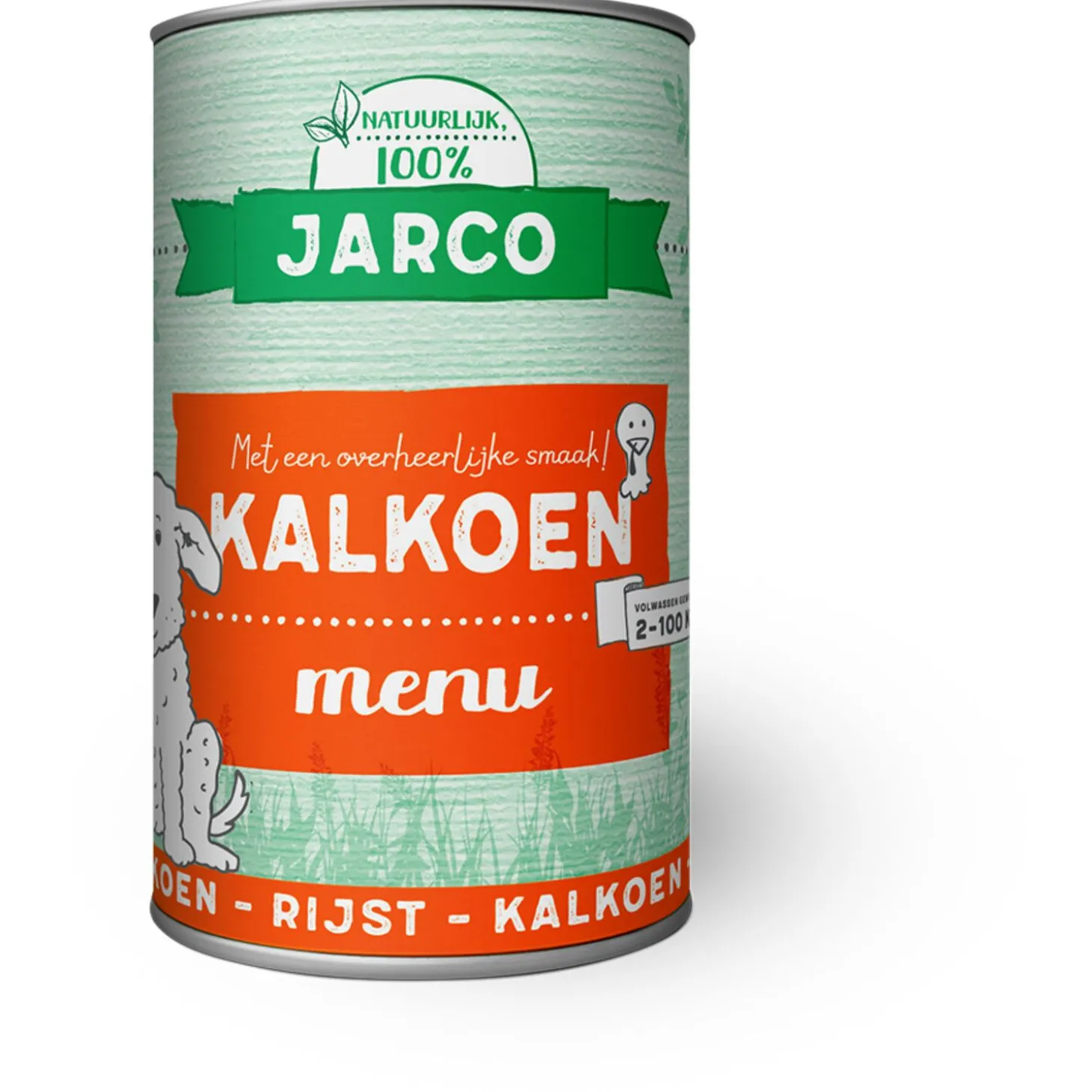 Dog Blikvoeding van Jarco is verkrijgbaar in 6 smaken met een inhoud van 400g.