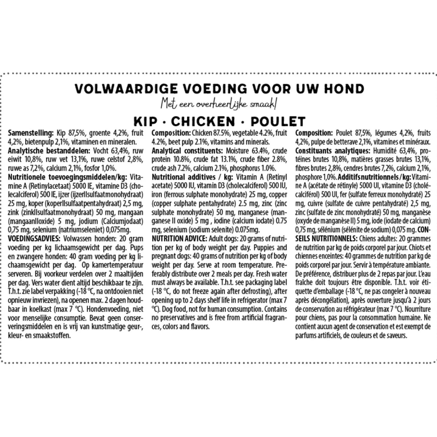 | Samenstelling | Kip 87,5%, groente 4,2%, fruit 4,2%, bietenpulp 2,1%, vitaminen en mineralen. |