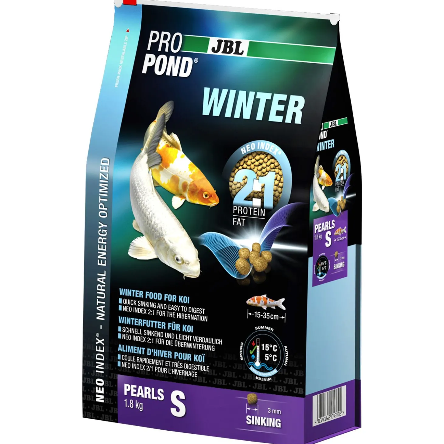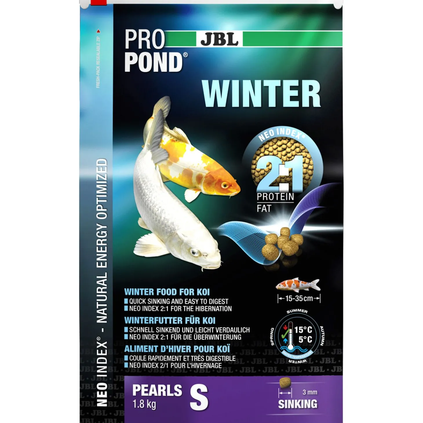 - Met tarwe, zalm, visolie, garnalen en maïs voor krachtige en gezonde koi (bij 5-15 °C watertemperatuur)
