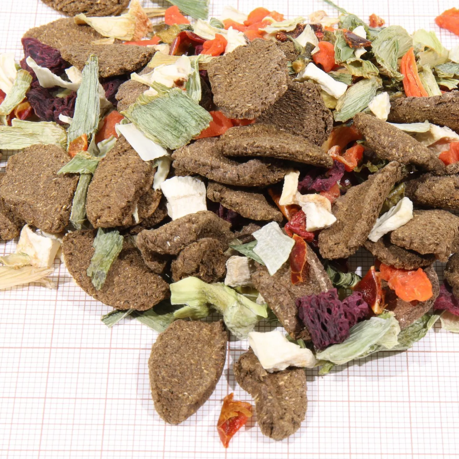 | Samenstelling | Paprika; Wortels; Luzernemeel; Prei; Tarwekiemmeel; Rode bieten; Griesmeel; Spinaziemeel; Appelvezels; Pastinaak; Broccoli; Bietendroogsnijdsel |