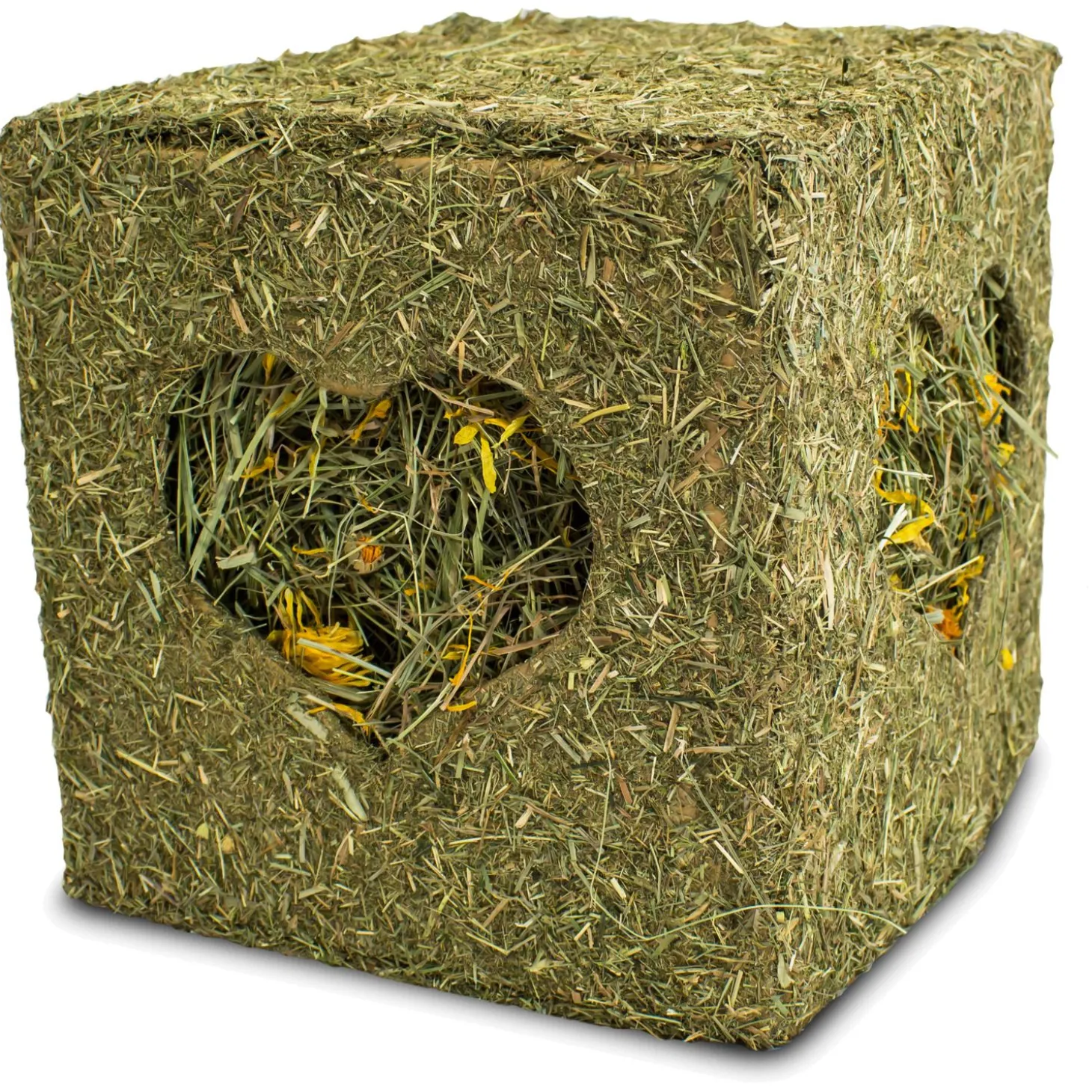 De kubus biedt aan dwergkonijnen en andere kleine dieren een voederplaats én speelhol in één. De vulling van aromatisch bergweidehooi bevat veel ruwe vezels die een positief effect hebben op het slijten van de tanden. De geurige goudsbloembloesems zorgen op hun beurt weer voor een licht ontstekingsremmend effect.
