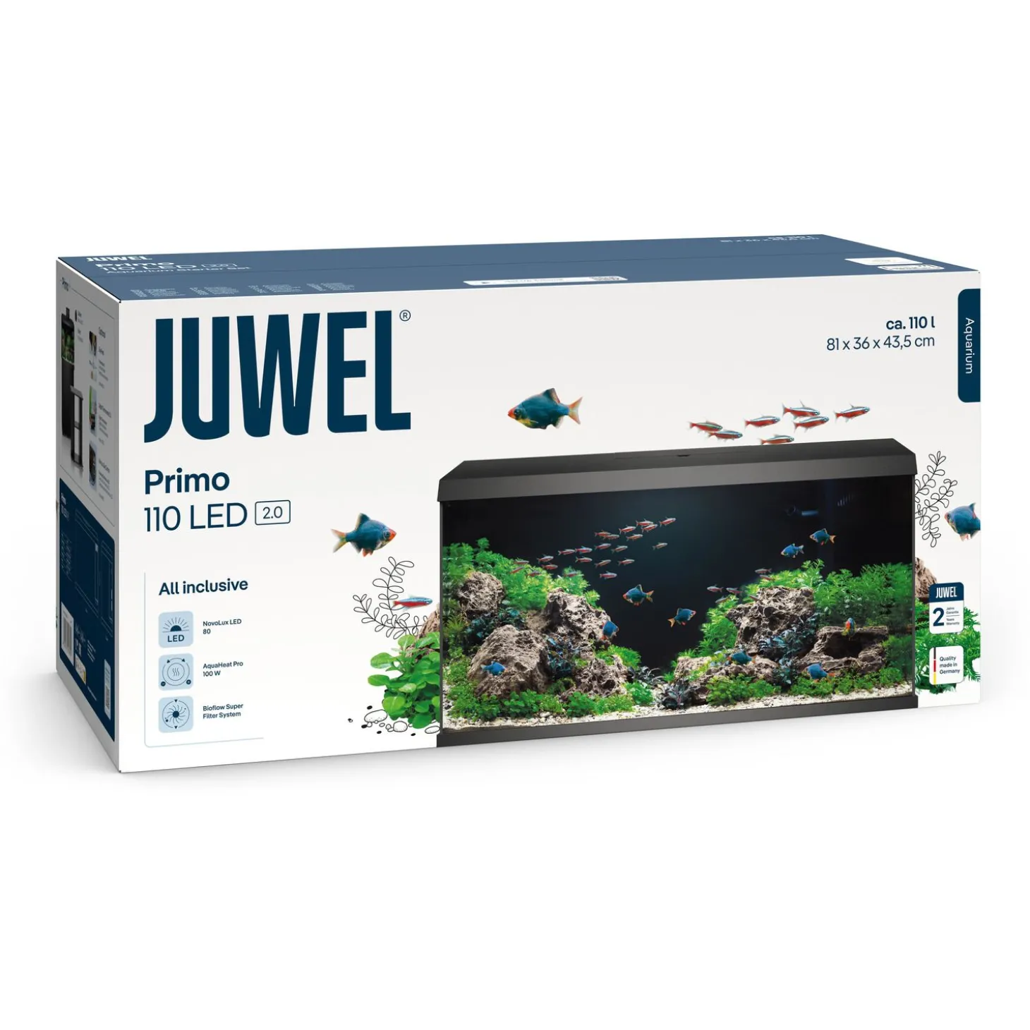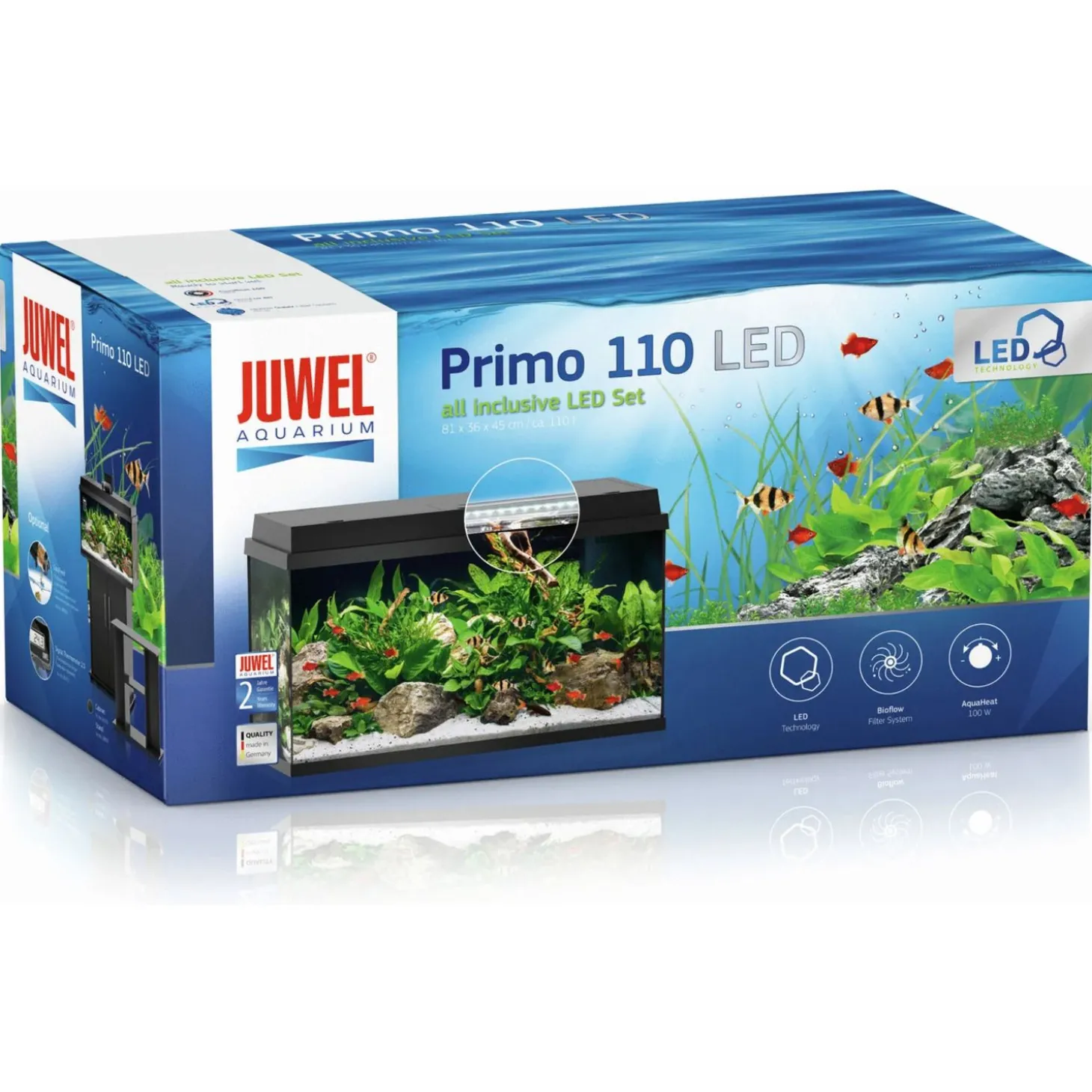 De Primo 110 is uitgerust met de NovoLux 80 LED lamp met 10.5 Watt verlichting. De lengte van de LED verlichting is afgestemd op de grootte van het Juwel aquarium. Hierdoor is er een gelijkmatige verdeling van het licht. De lichtbalk is op een speciale manier gelast waardoor hij 100% waterdicht is. Ook deze voldoet aan de Europese Veiligheidsnorm en is TUV/GS gecertificeerd.