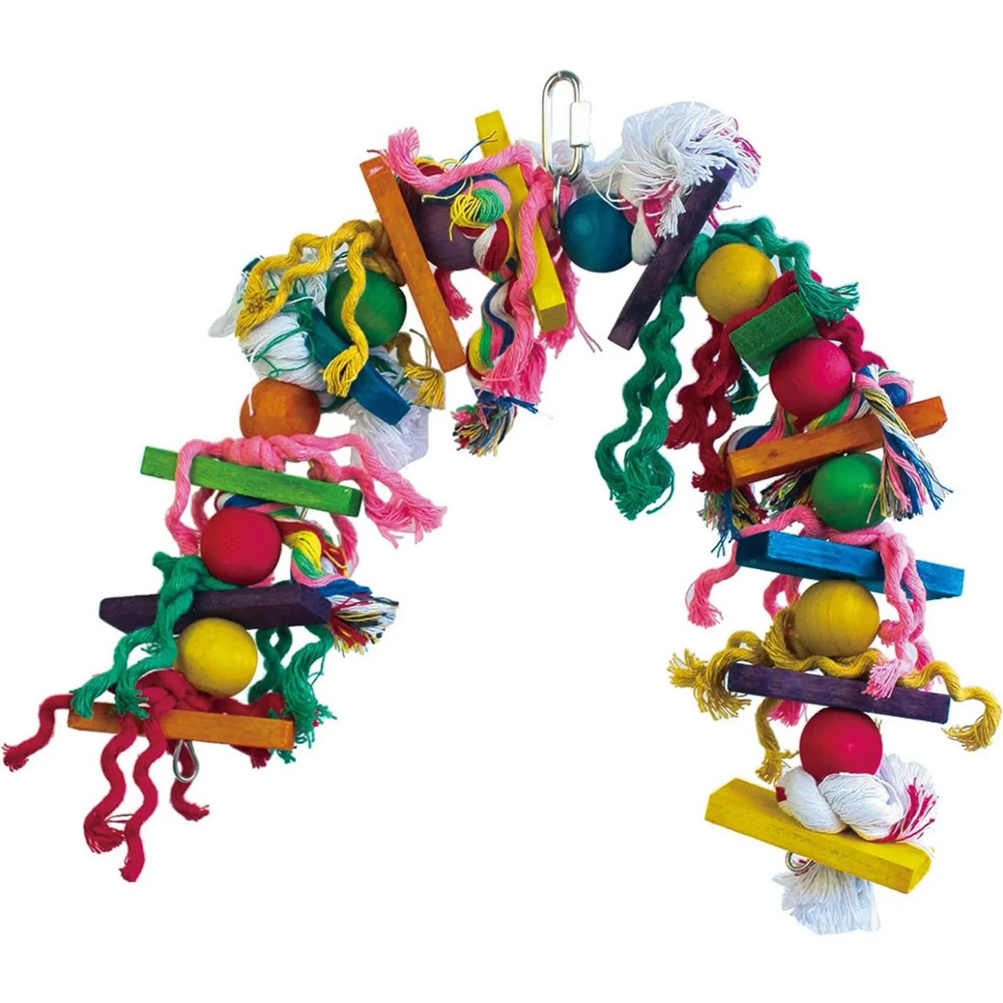 Dit speelgoed bestaat uit verschillende gekleurde touwtjes met houten kralen en plaatjes. Dit hangende speeltje zorgt voor genoeg beweging en speelplezier voor jouw vogel. Hij kan er mee spelen en op klimmen. Zo blijft je vogel in beweging, wat zorgt voor een goede conditie en spierontwikkeling. Daarnaast draagt het bij aan het mentale welzijn van je vogel en voorkomt het verveling. Dit kleurrijke speeltje zal veel afwisseling en uitdaging geven aan je vogel.