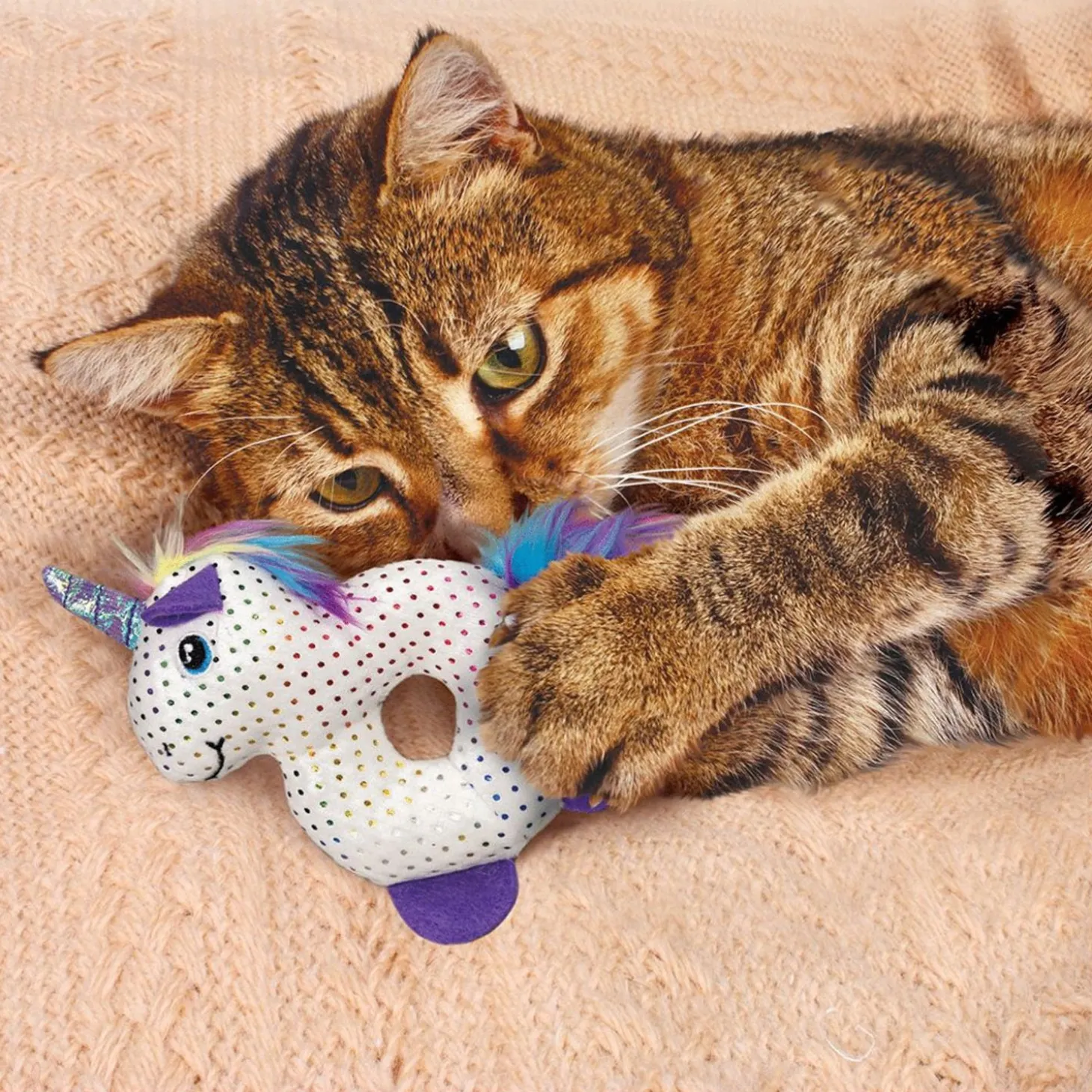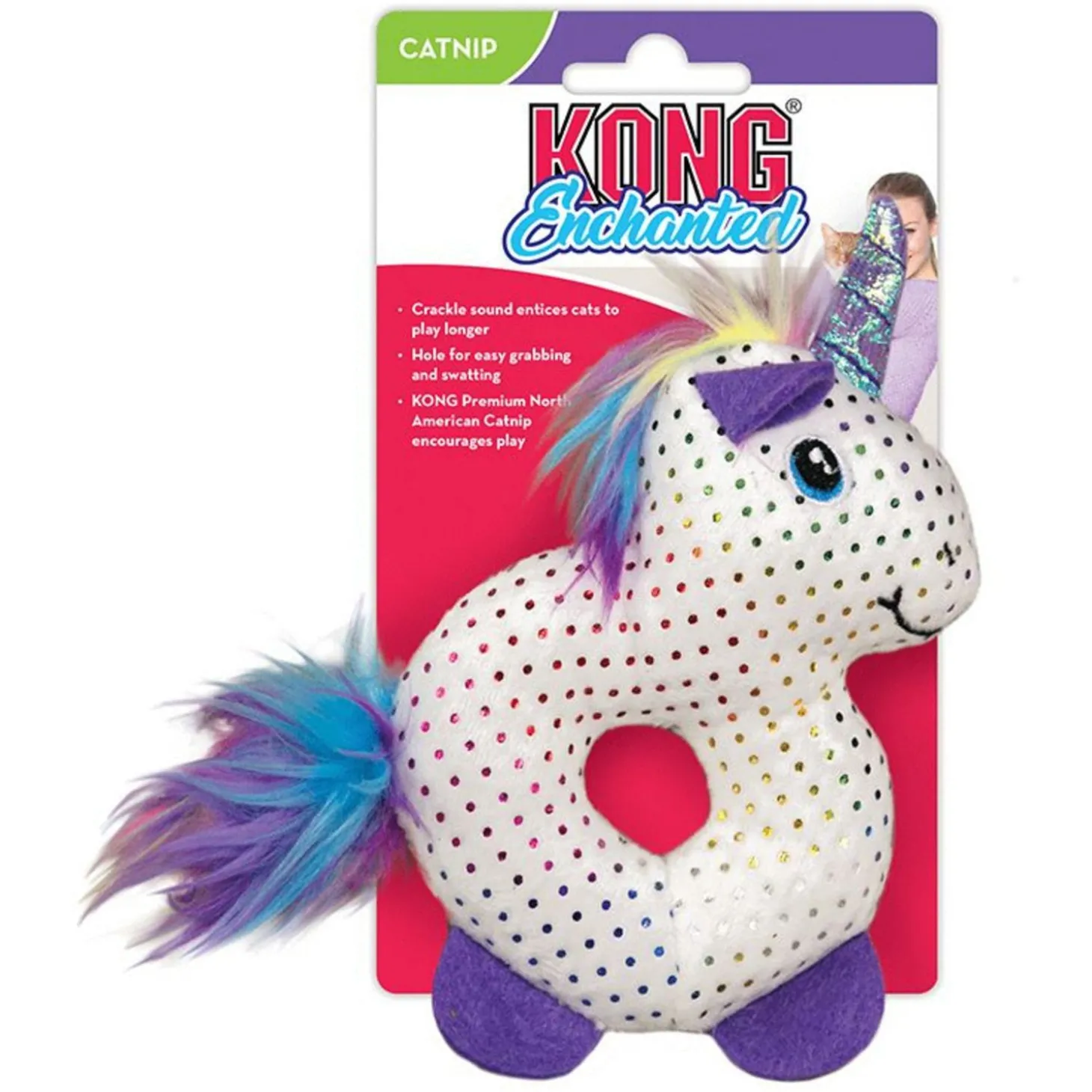 Deze kan je niet laten liggen hoor! De vrolijk glanzende, met regenboogkleurende stippen Enchanted Characters van KONG gaan het helemaal maken bij jou kat! De rijk met kattenkruid gevulde Enchanted wezentjes maken een onweerstaanbaar kreukelgeluid. Ze hebben alles waar jouw kat van droomt; ze zijn makkelijk weg te meppen maar ook beet te pakken door het handige gat in het midden van ieder speeltje. Ze licht van gewicht en dus ook makkelijk mee te nemen naar een rustiger plekje. De Enchanted Characters zijn verkrijgbaar in verschillende figuurtjes.