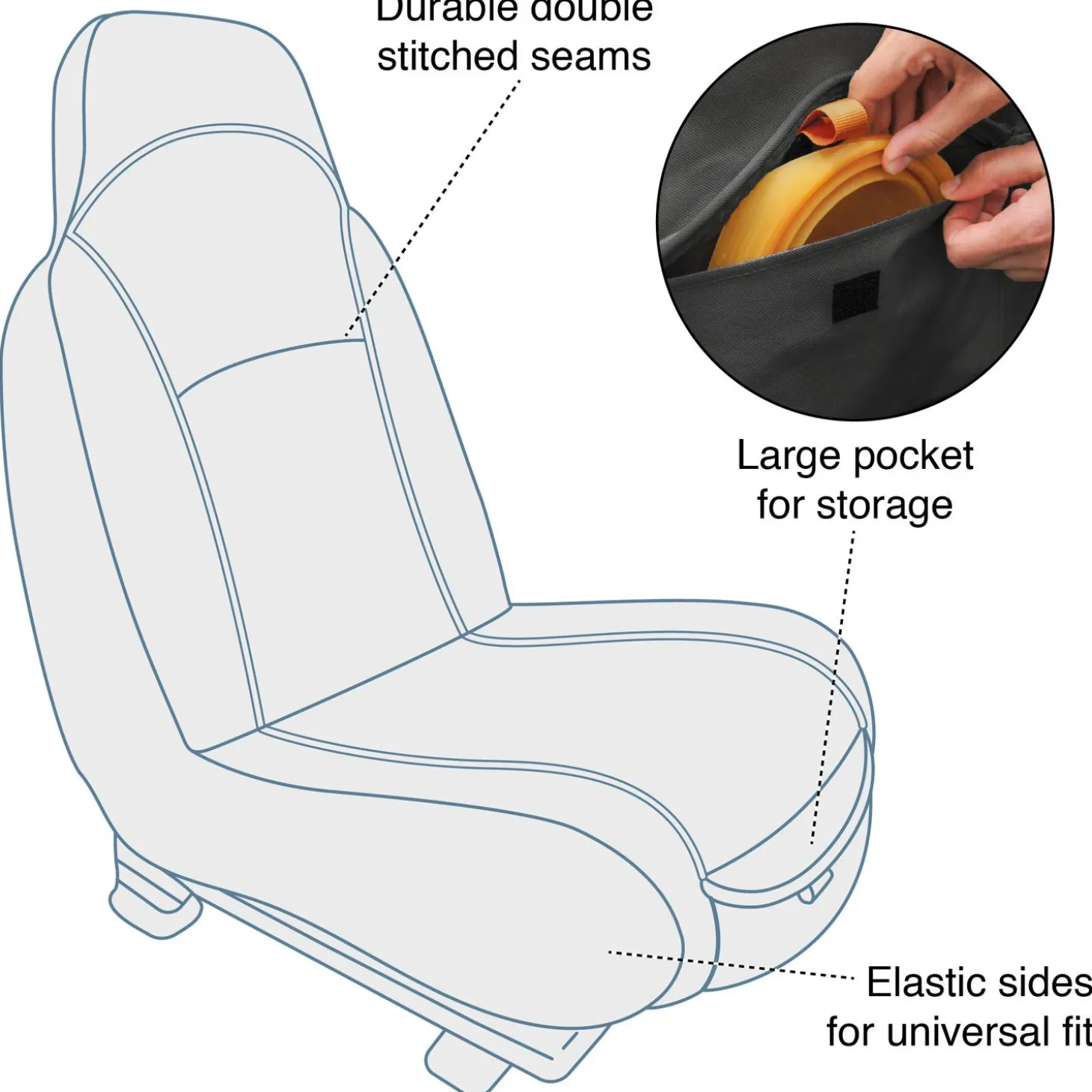 Wat deze hoes ook handig maakt, is dat eventuele kindervoetjes op de achterbank de voorstoel niet vies maken! Ook zit er aan de voorkant van de hoes een opbergvakje om eventueel een drinkbakje of speeltjes in de bewaren. De ribbels aan de zijkant van de hoes zorgen ervoor dat het vuil zoals zand niet op de grond valt. Deze zijkanten zijn ook elastisch wat ervoor zorgt dat deze op bijna elke voorstoel past.