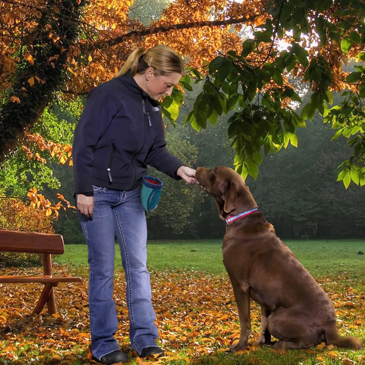 Laat de snacks maar komen, want met deze speciale hondensnackzak neem je snacks en brokjes met gemak mee. De Go-Stuff-It Treat Bag van Kurgo is ontworpen om gemakkelijk aan een riem te worden bevestigd, of op te hangen met een meegeleverde karabijnhaak aan een hondenren of ergens anders waar je je hond een beloning wilt geven. De trekkoordsluiting houdt lekkernijen vers en het extra vak met ritssluiting is perfect voor sleutels, geld of poepzakjes.