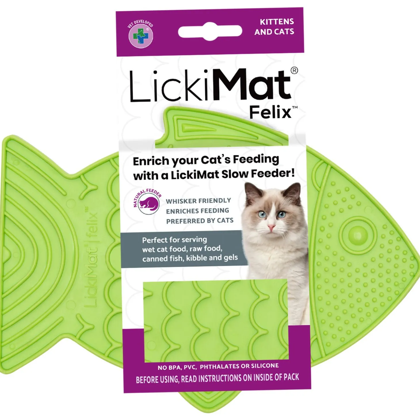 - De zorgvuldig ontworpen LickiMat vermindert de spanning op de snorhaartjes