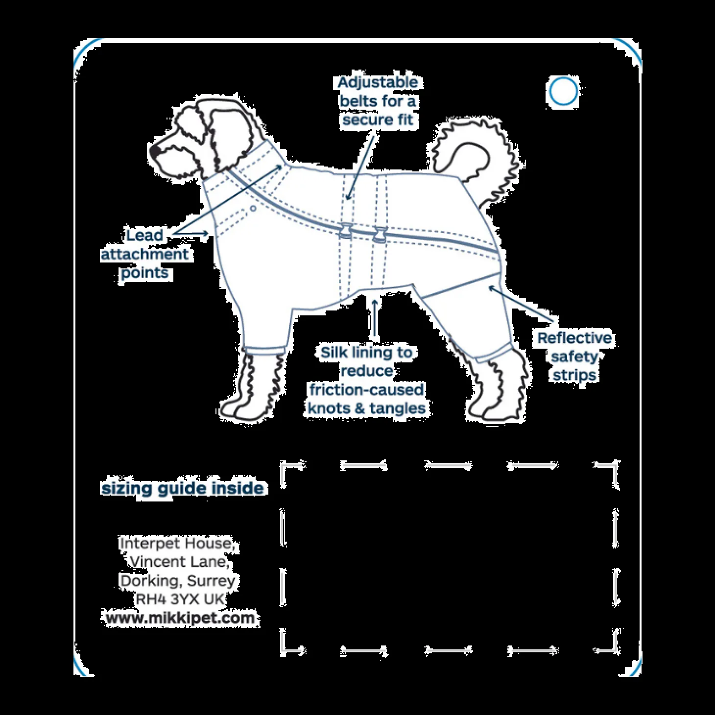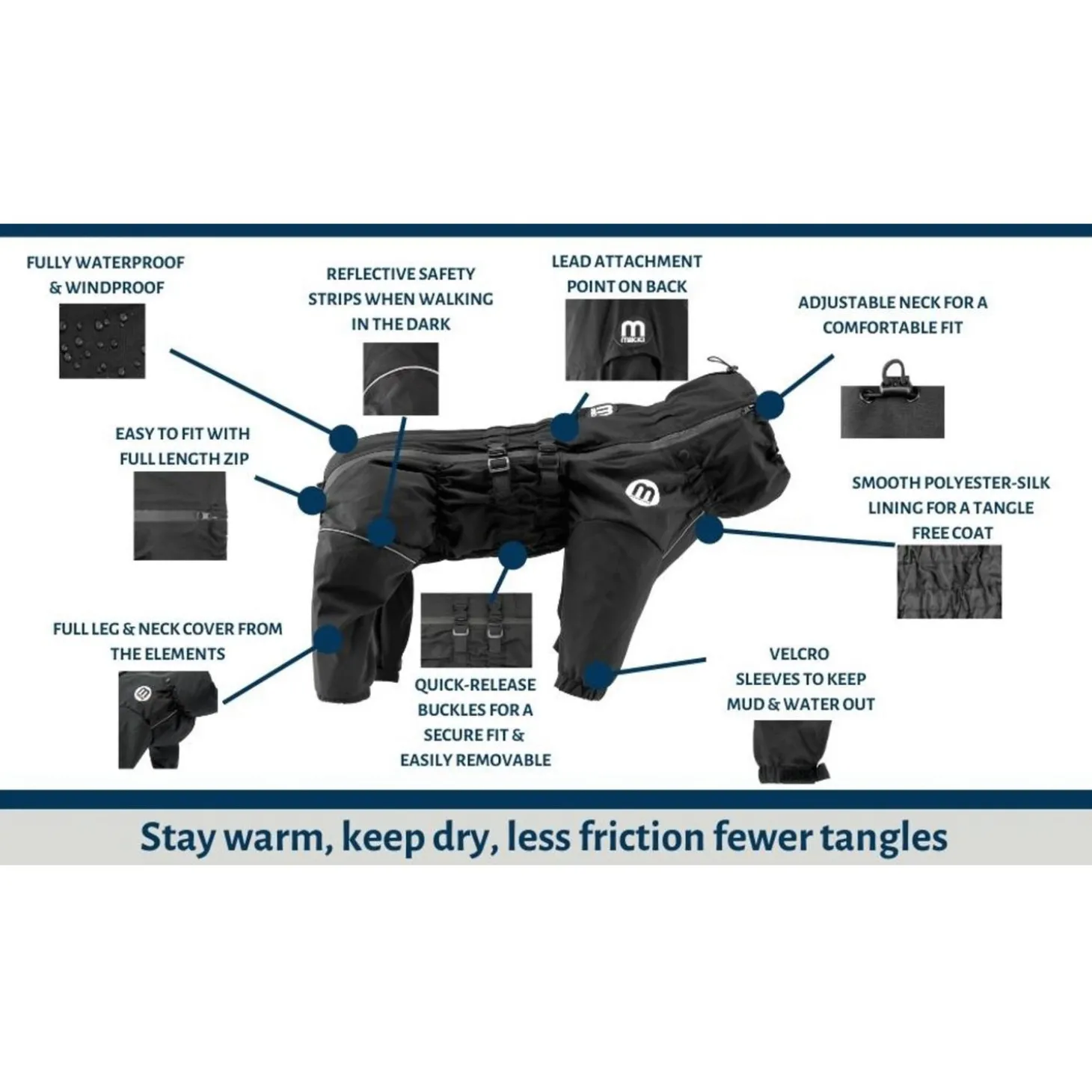 De jas bedekt naast de romp ook de nek en de vier poten van je hond voor optimale bescherming van de vacht. Om de hondenjas wel goed aan te laten sluiten is deze verstelbaar rond de nek, taille en poten voor de perfecte pasvorm. Hierdoor zit de jas mooi en comfortabel. Verder bevat de jas reflecterende strepen zodat je hond ook goed zichtbaar is in het donker.