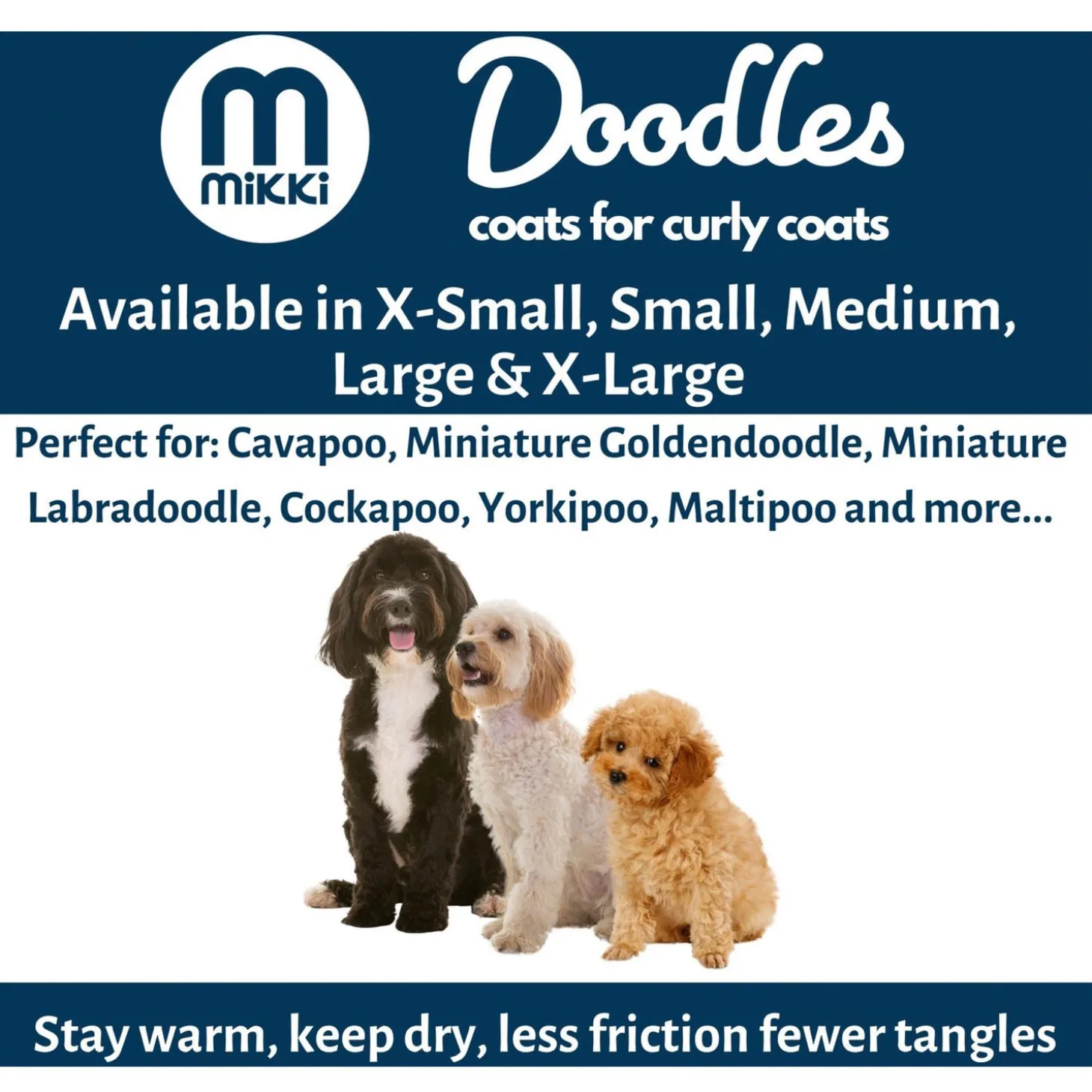 Wanneer je je hond gaat uitlaten in winters en regenachtig weer, kan je snel met een vacht vol klitten thuiskomen. Zeker bij doodle-kruisingen zoals de labradoodle, goldendoodle en cockapoo kan dit snel het geval zijn. Daarom heeft Mikki de Doodle Coat ontwikkeld, speciaal voor de gekrulde vacht. Hiermee kan je zonder zorgen lekker met je viervoeter op elk moment naar buiten!