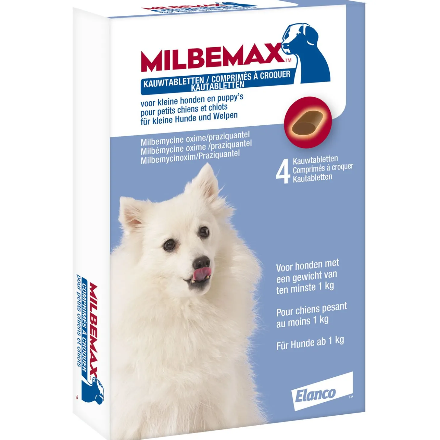 Milbemax Kauwtablet Kleine Hond en Pup bevat 4 tabletten.