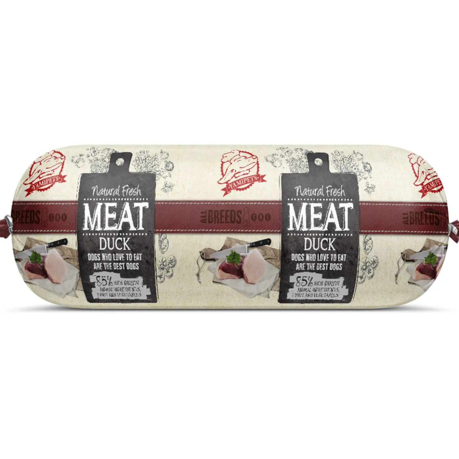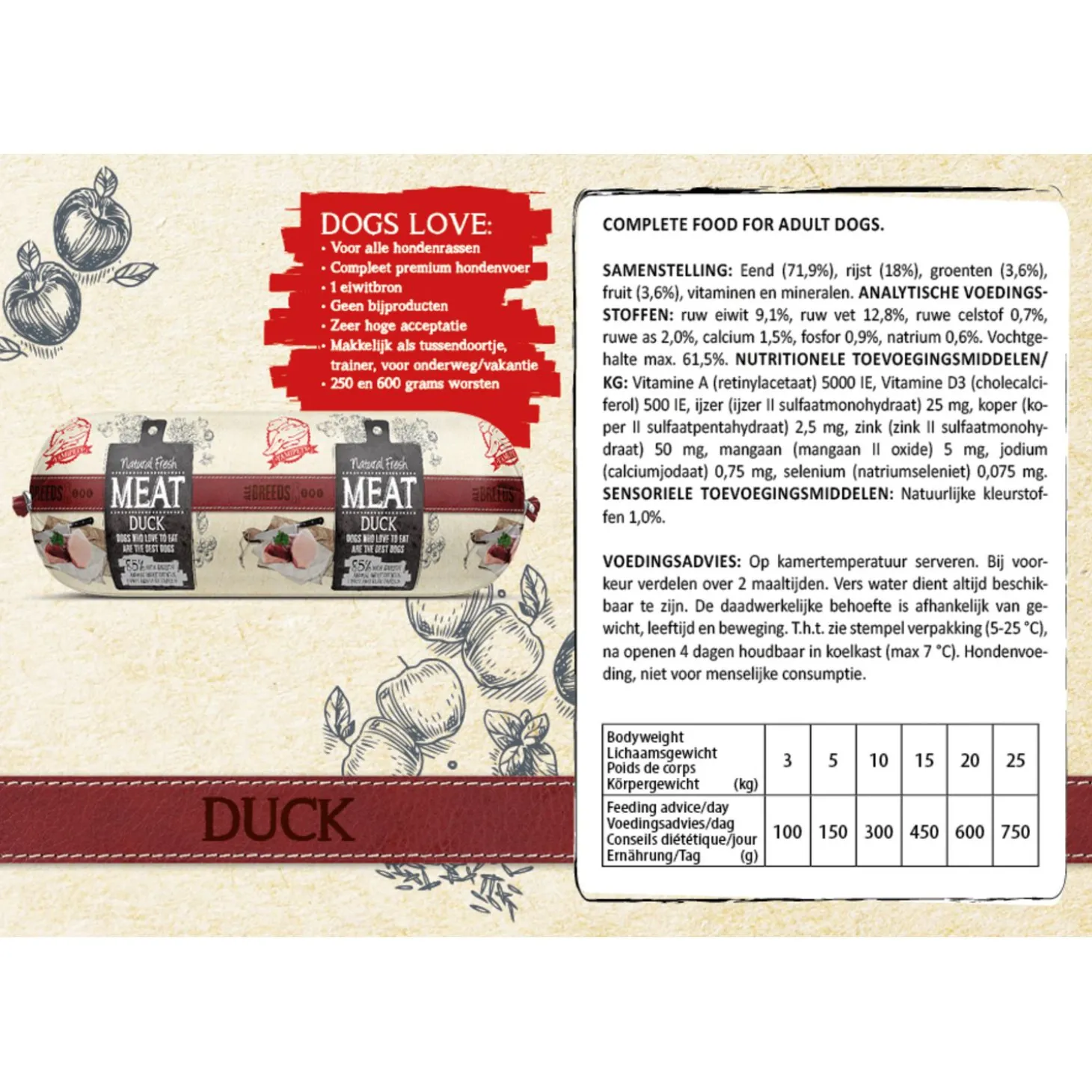Natural Fresh Meat Sausage Duck is verkrijgbaar in 250 g en 600 g.