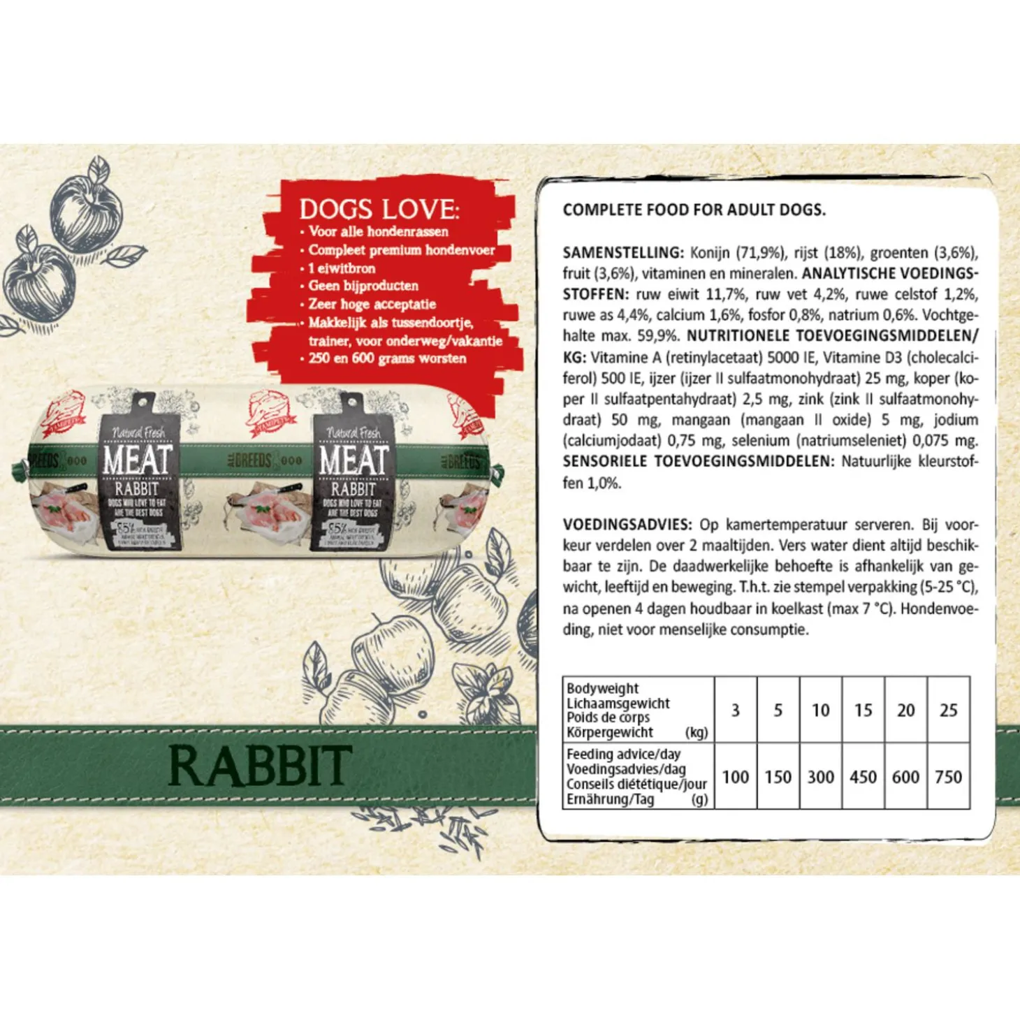 | Samenstelling | Konijn (71,9%), rijst (18%), groenten (3,6%), fruit (3,6%), vitaminen en mineralen. |