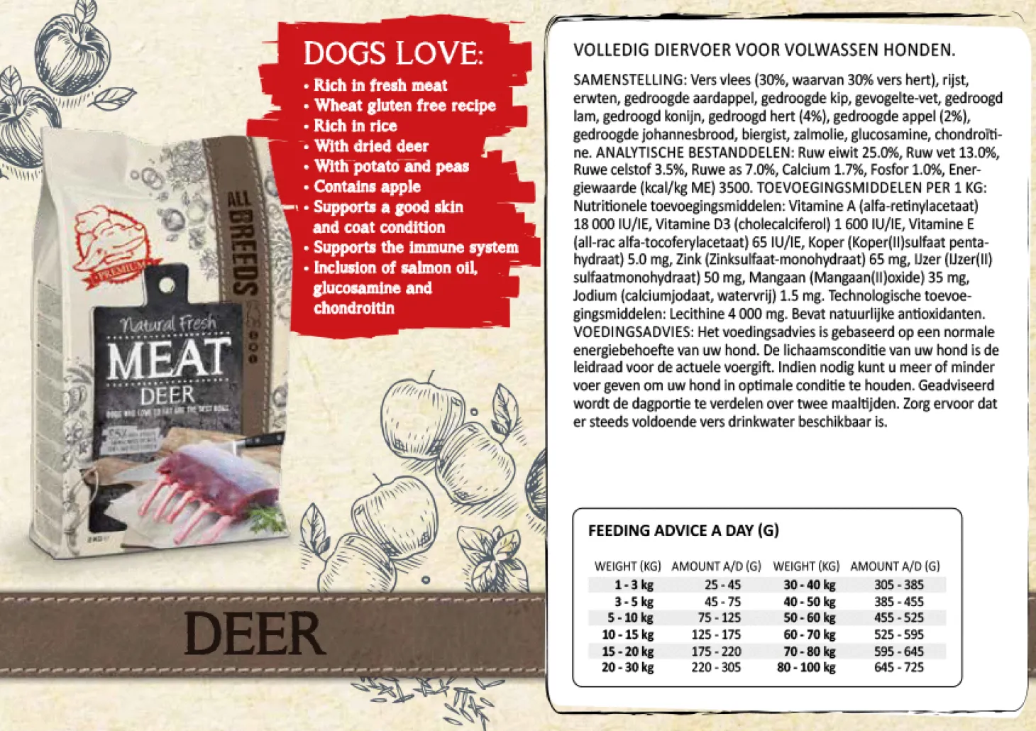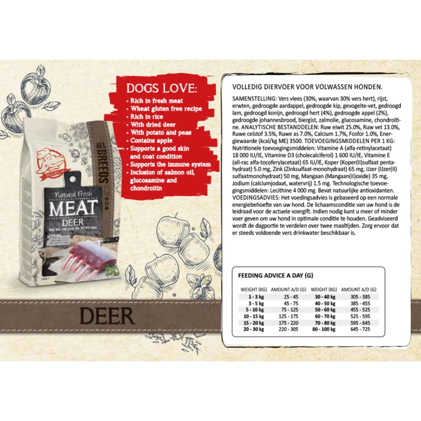 | Samenstelling | Vers vlees (30%, waarvan 30% vers hert), rijst, erwten, gedroogde aardappel, gedroogde kip, gevogelte-vet, gedroogd lam, gedroogd konijn, gedroogd hert (4%), gedroogde appel (2%), gedroogde johannesbrood, biergist, zalmolie, glucosamine, chondroïtine. |