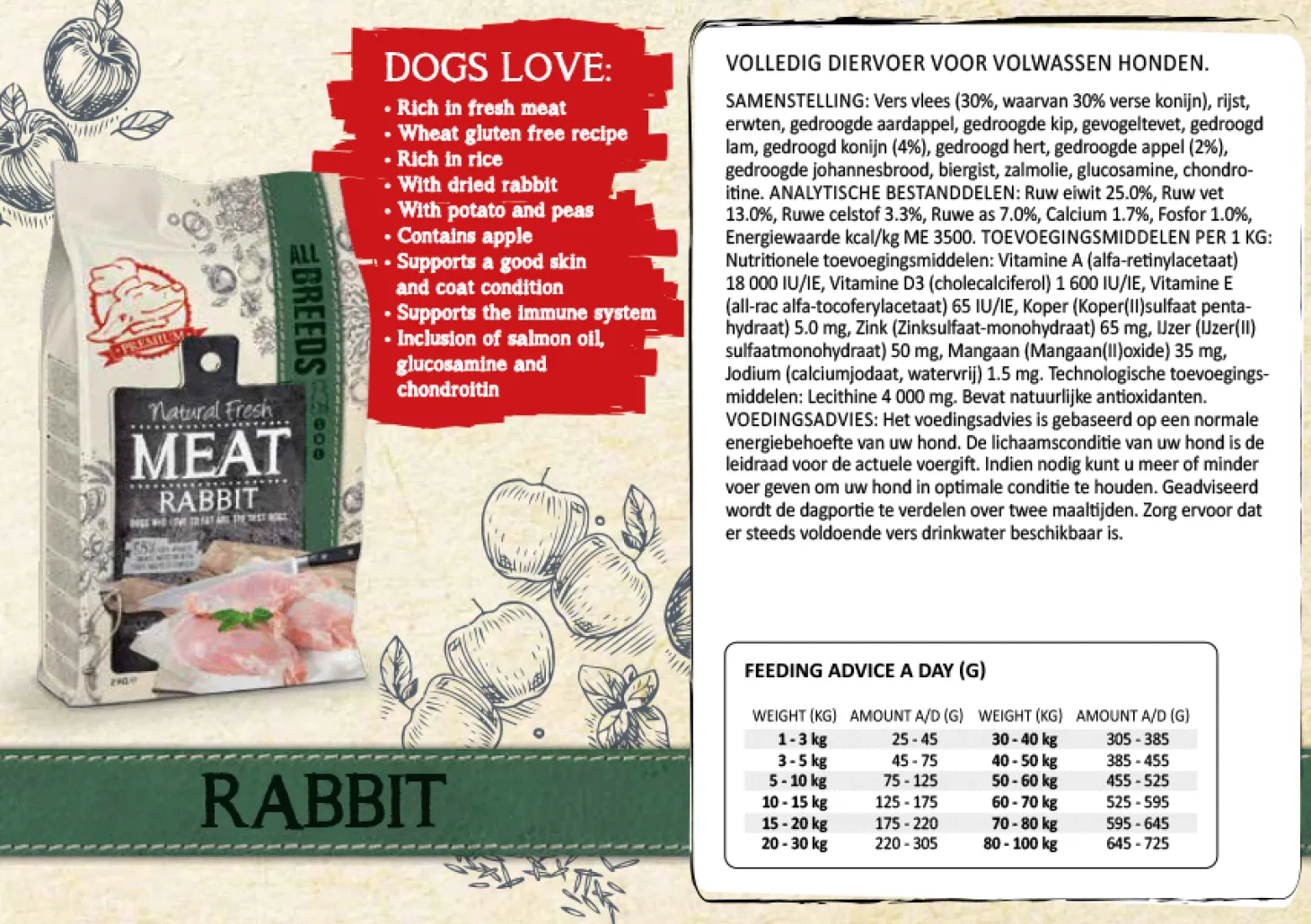 | Samenstelling | Vers vlees (30%, waarvan 30% verse konijn), rijst, erwten, gedroogde aardappel, gedroogde kip, gevogeltevet, gedroogd lam, gedroogd konijn (4%), gedroogd hert, gedroogde appel (2%), gedroogde johannesbrood, biergist, zalmolie, glucosamine, chondroïtine. |