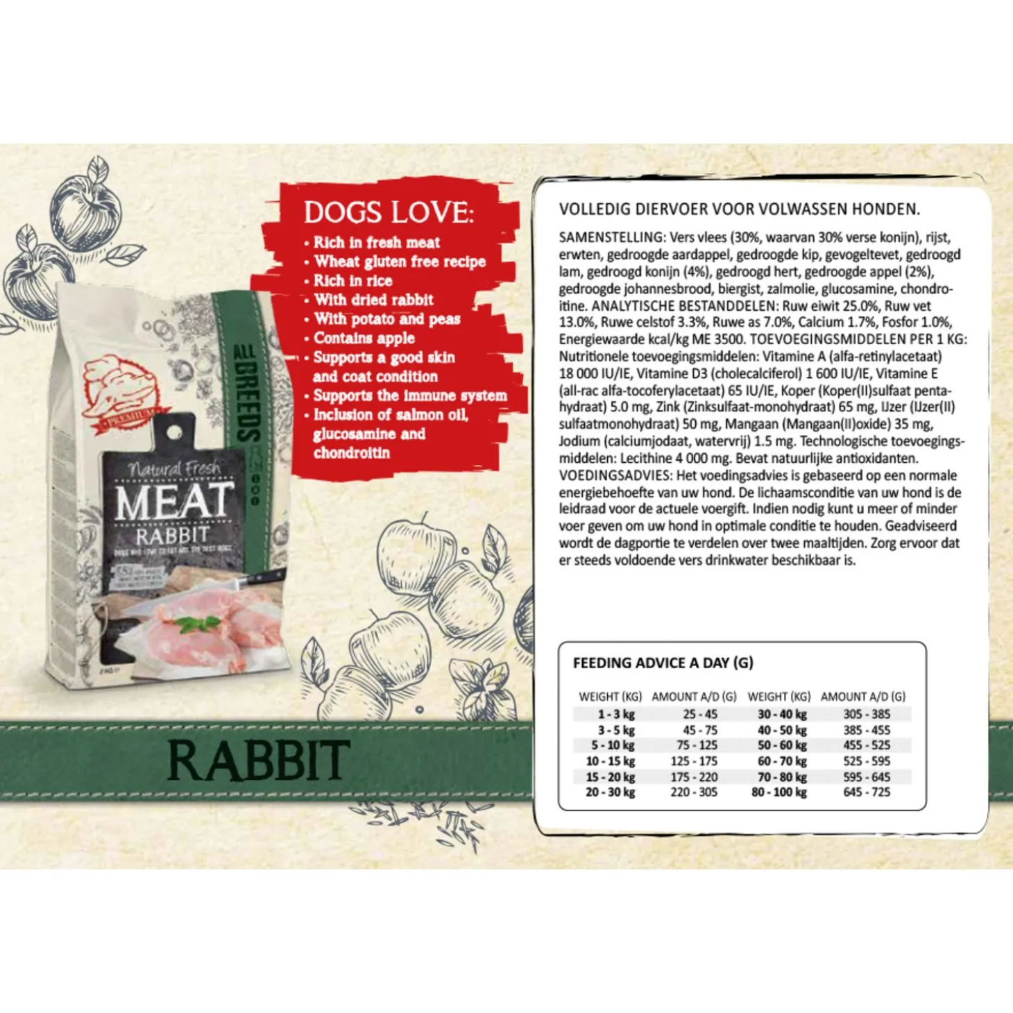 Natural Fresh Meat All Breeds Konijn is verkrijgbaar in 2 kg en 12 kg.