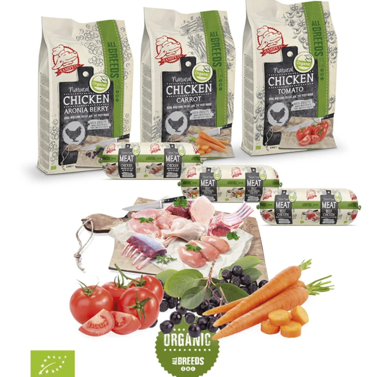 | Samenstelling | Biologische kip (69%), Biologisch rund (12%), Biologische rijst (18%), vitaminen en mineralen (1%). |
