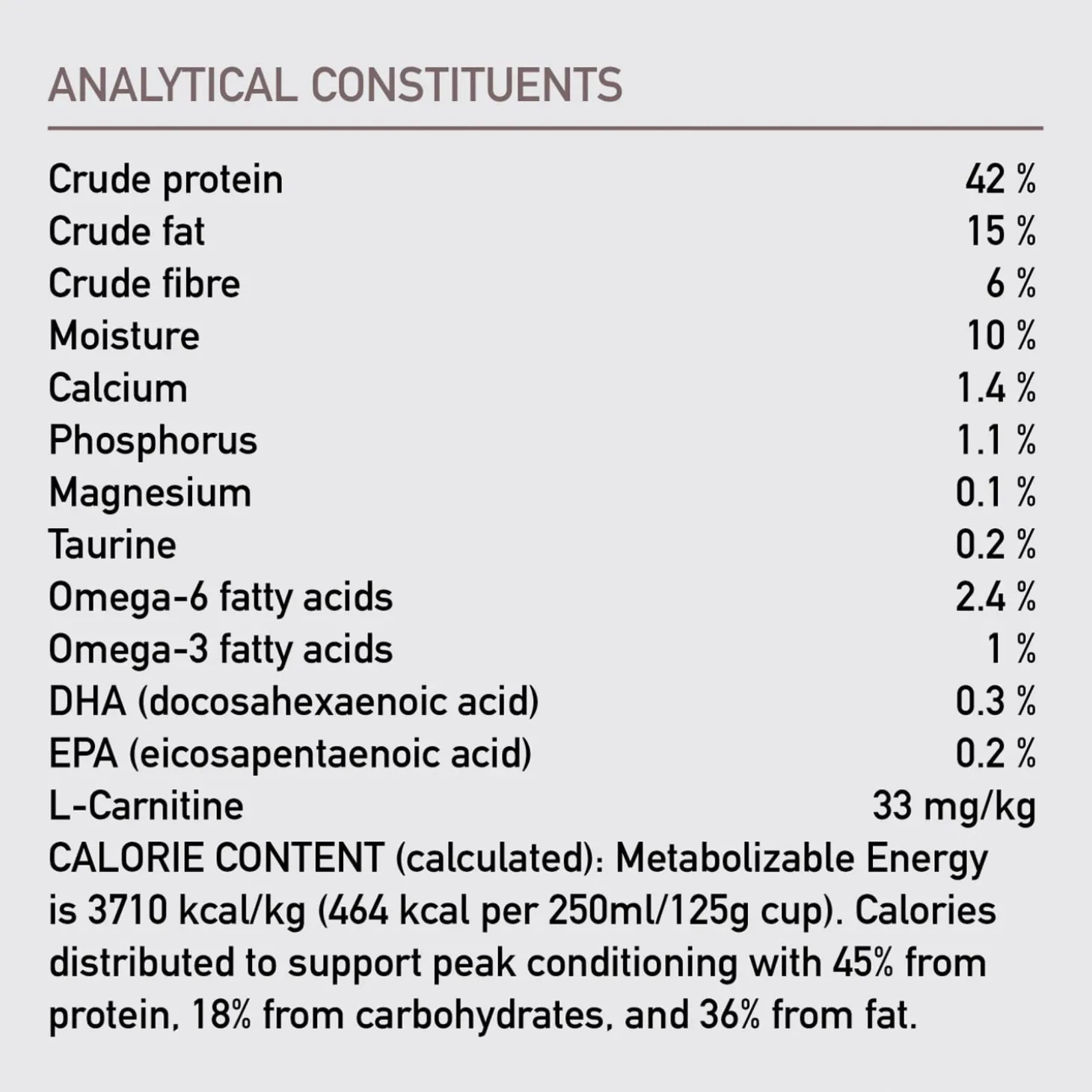 | Analyse | Ruw eiwit 44 %Ruw vet 15 %Ruwe as 10 %Ruwe celstof 6 %Vocht 10 %Calcium 1,4 %Fosfor 1,1 %Magnesium 0,1 %Taurine 0,2 %Omega-6 2,4 %Omega-3 1 %DHA / EPA 0,3 % / 0,2 %L-Carnitine 33 mg/kg |