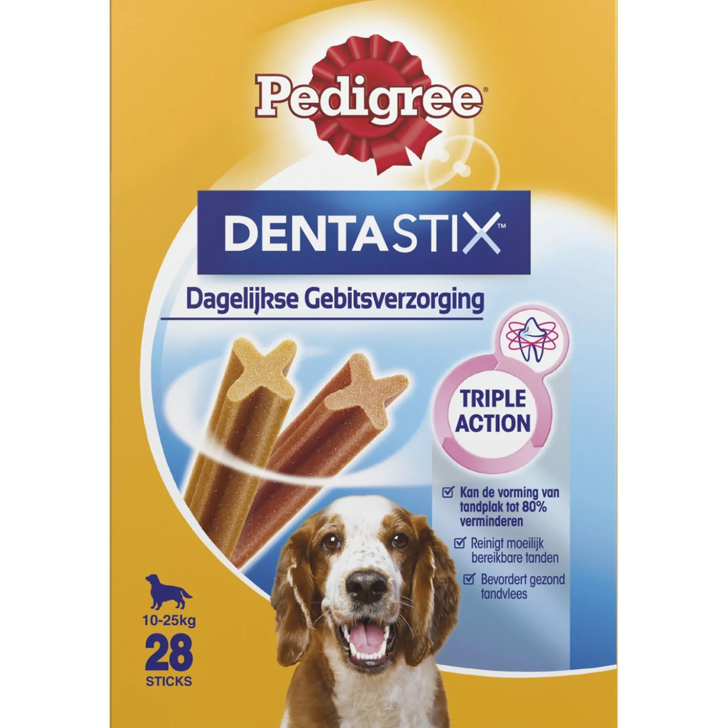 Pedigree DentaStix heeft een unieke x-vorm die om de tanden van de hond heen valt en deze zo reinigt. Wanneer dit dagelijks gevoerd wordt, kan het de opbouw van tandsteen tot wel 80% verminderen.