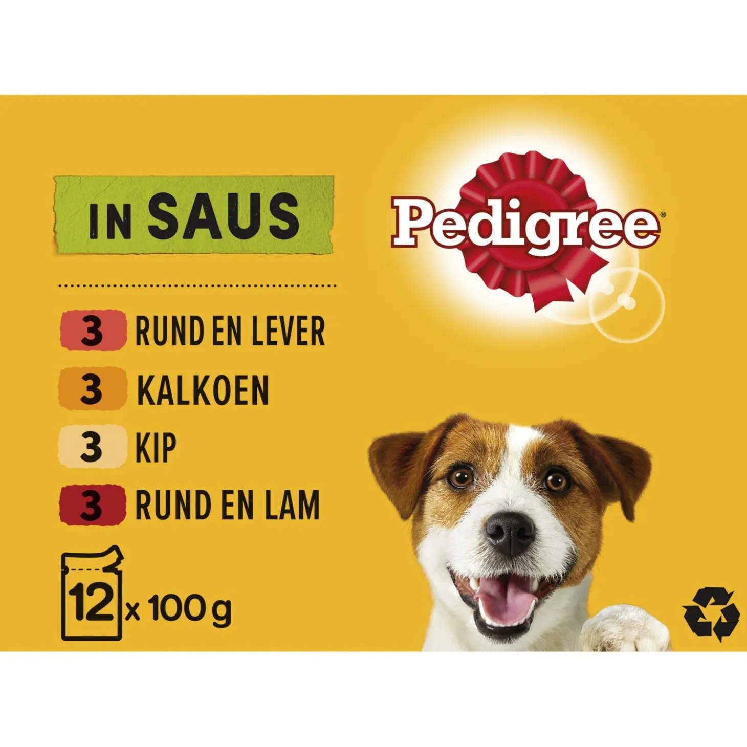 Pedigree Maaltijdzakjes Adult Selection Multipack in Saus bevat 12 maaltijdzakjes van 100 g in 4 verschillende smaken.