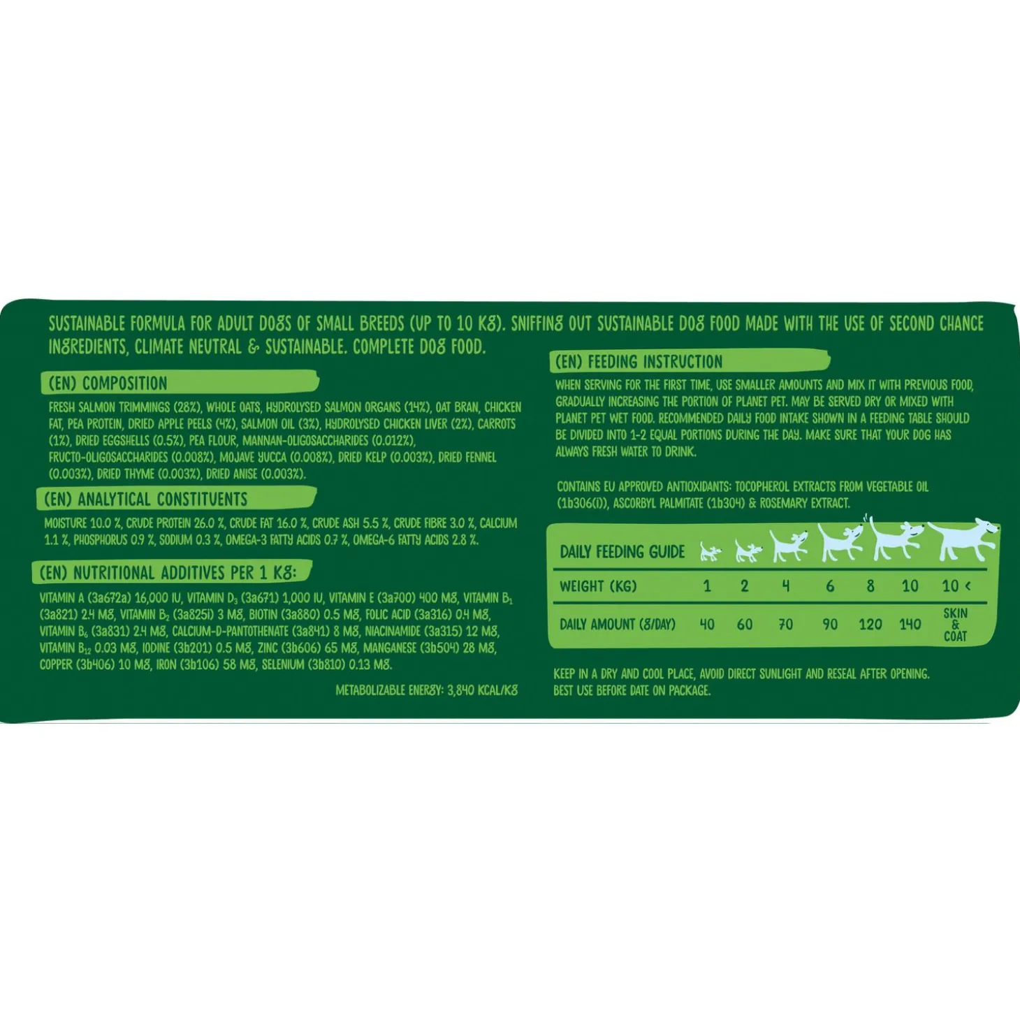 | Samenstelling | Samenstelling: verse zalmsnijresten (28%), hele haver, gehydrolyseerde zalmorganen (14%), haverzemelen, kippenvet, erwteneiwit, gedroogde appelschillen (4%), zalmolie (3%), gehydrolyseerde kippenlever (2%), wortel (1%), gedroogde eierschaal (0,5%), erwtenmeel, mannan-oligosacchariden (0,012%), fructo-oligosacchariden (0,008%), yucca schidigera (0,008%), gedroogde kelp (0,003%), gedroogde venkel (0,003%), gedroogde tijm (0,003%), gedroogde anijs (0,003%). |