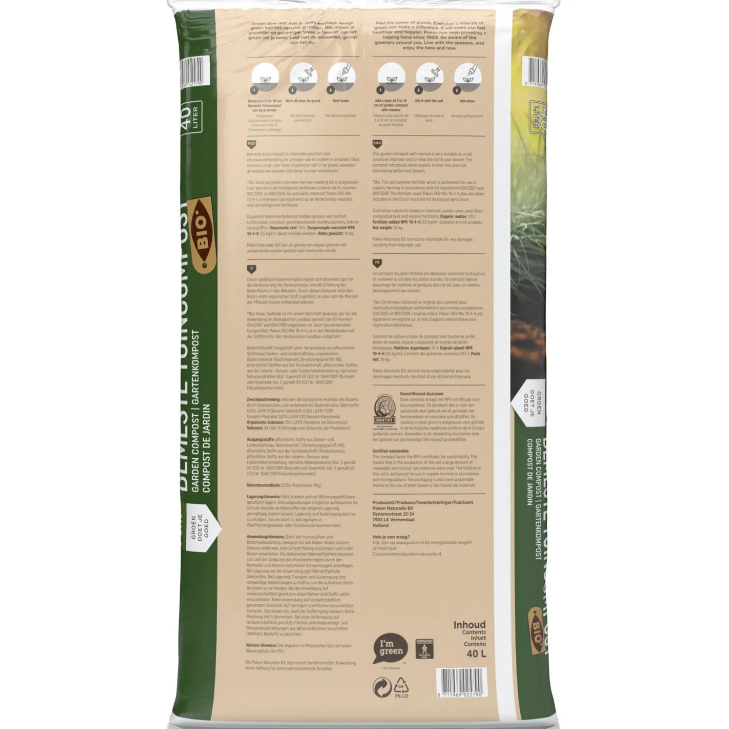 | Samenstelling | Pokon MPS Bio Bemeste Tuincompost is een mengsel van onder andere tuinturf, turfstrooisel, compost, gecomposteerde naaldhoutschors, kalk en meststoffen. Deze potgrond is bemest met Pokon EKO-Mix 10-4-4, dit is toegestaan voor gebruik in de biologische landbouw conform de EU normen 834/2007 en 889/2008. |